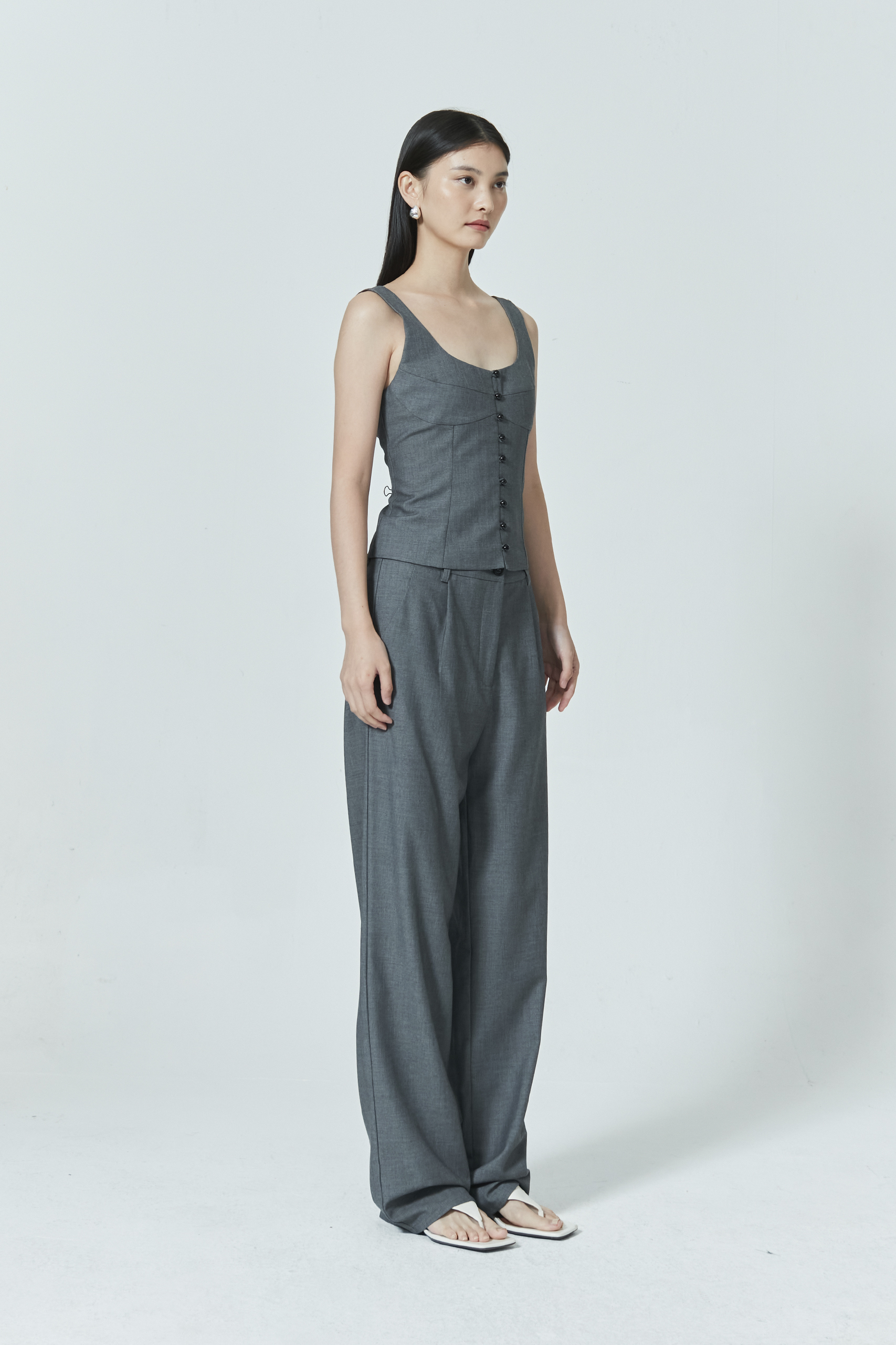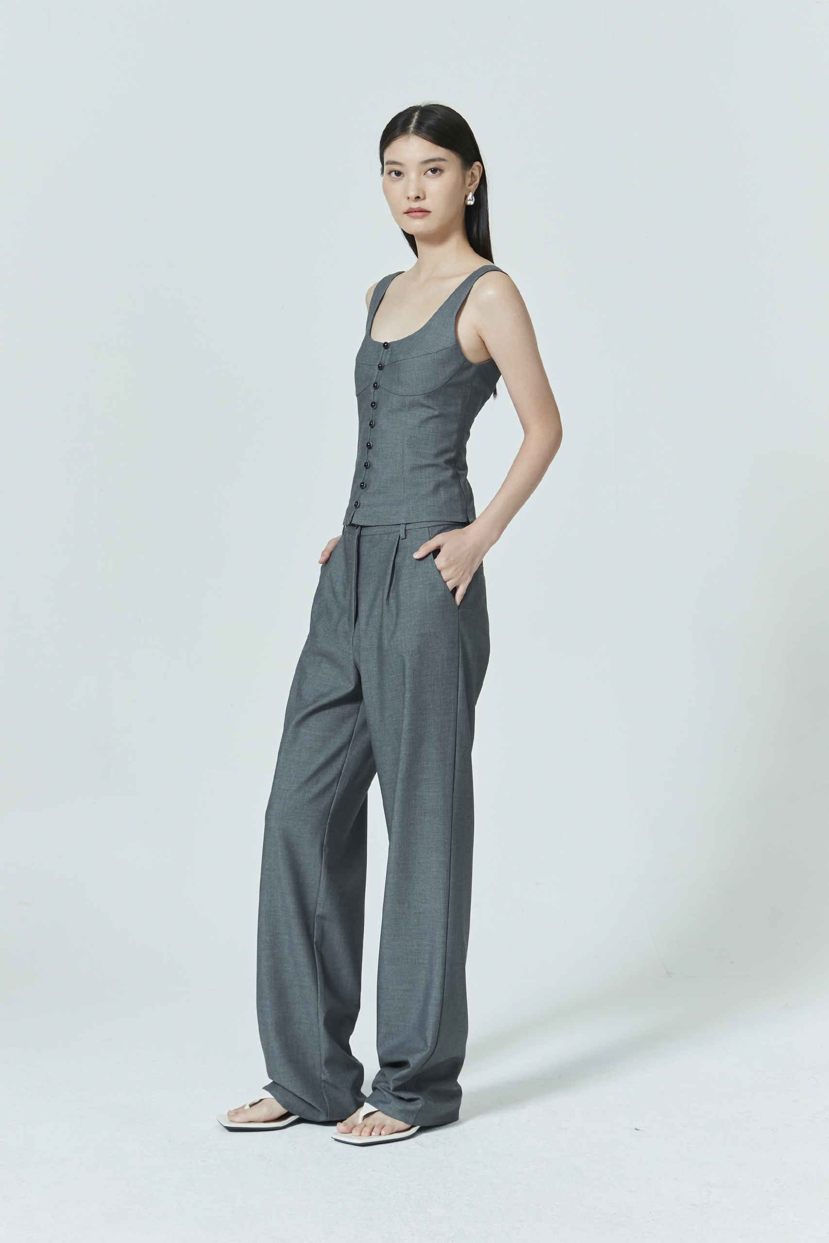 You can never go wrong with a pair of tailored full-length pants. Designed to elongate the legs, these pants also feature side pockets for your on-the-go needs. Pairs perfectly with the matching button front bustier top.