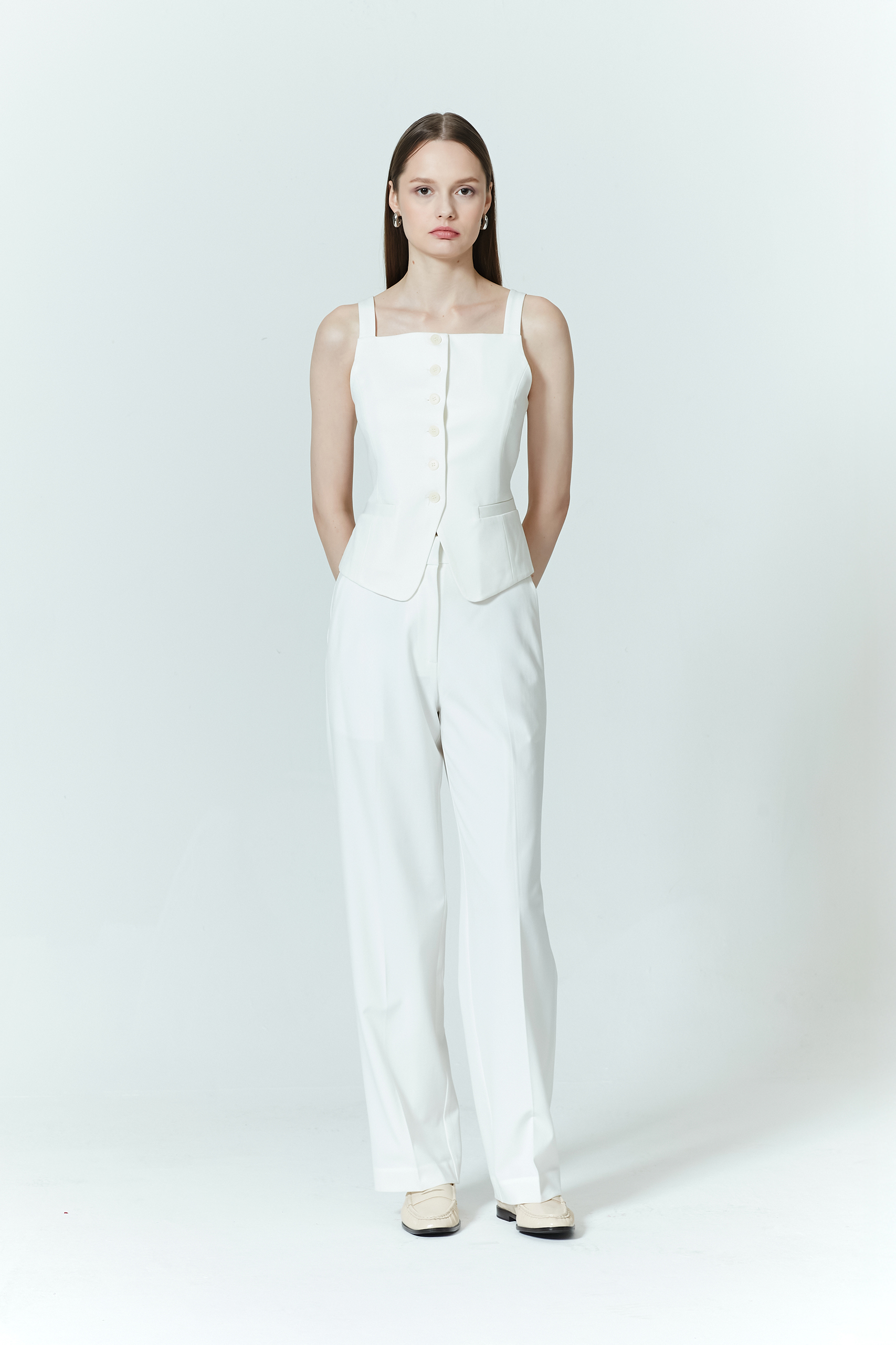 .A mid-waisted fit made from Tencel and rayon blend, designed with pockets and button detail on the back. These pants create a flattering, polished shape. It can easily be paired with the matching co-ord vest for a coordinated, stylish look.