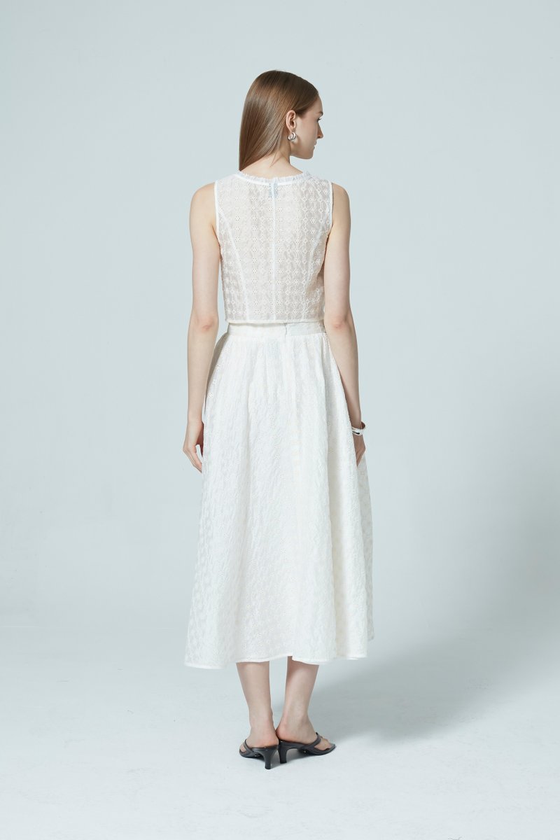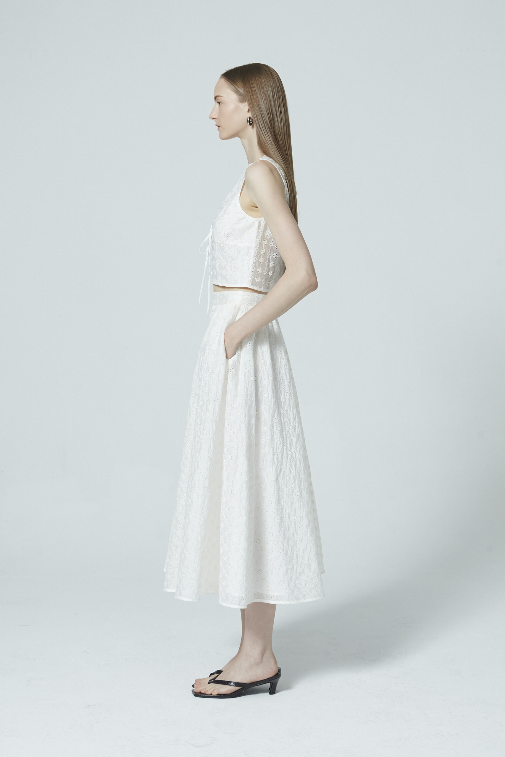 A lightweight midi skirt crafted from delicate ivory broderie and a softly gathered silhouette. Designed to sit comfortably at the waist, it falls with gentle volume for easy movement and an effortless, feminine finish. Fully lined for comfort and ease.