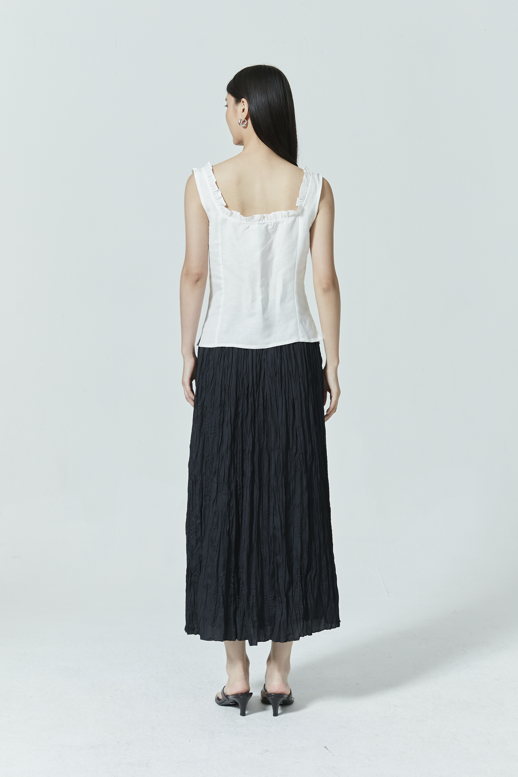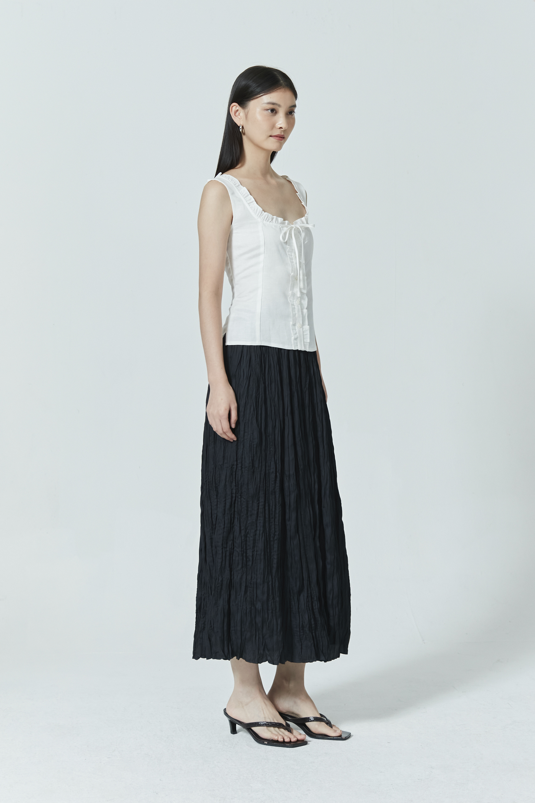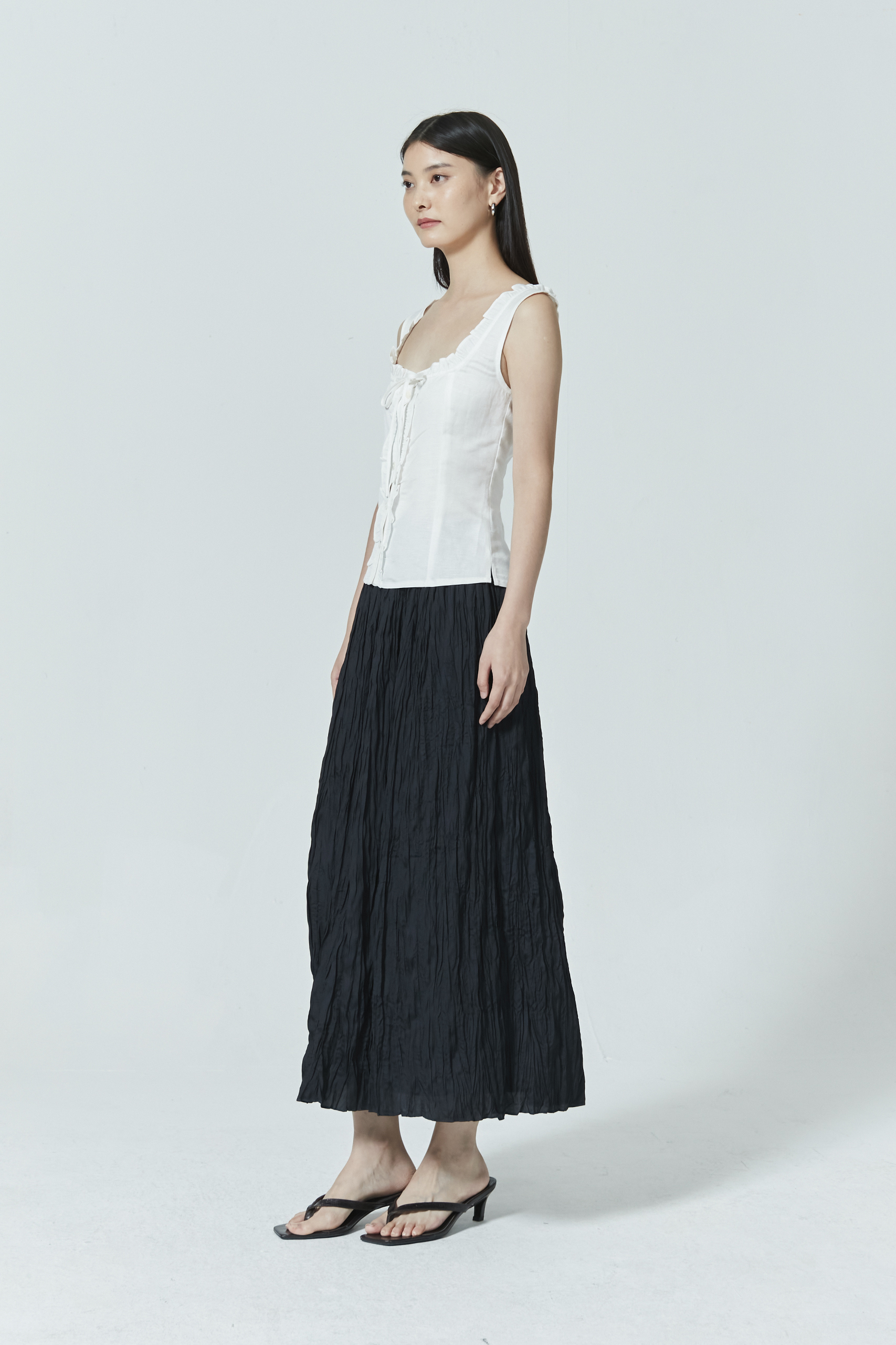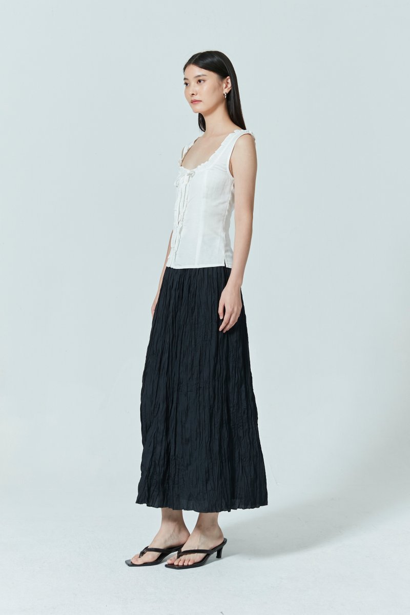 Textured elegance in motion. This fully lined crinkle maxi skirt drapes beautifully, creating a sophisticated, flowing silhouette that transitions seamlessly from day to night.