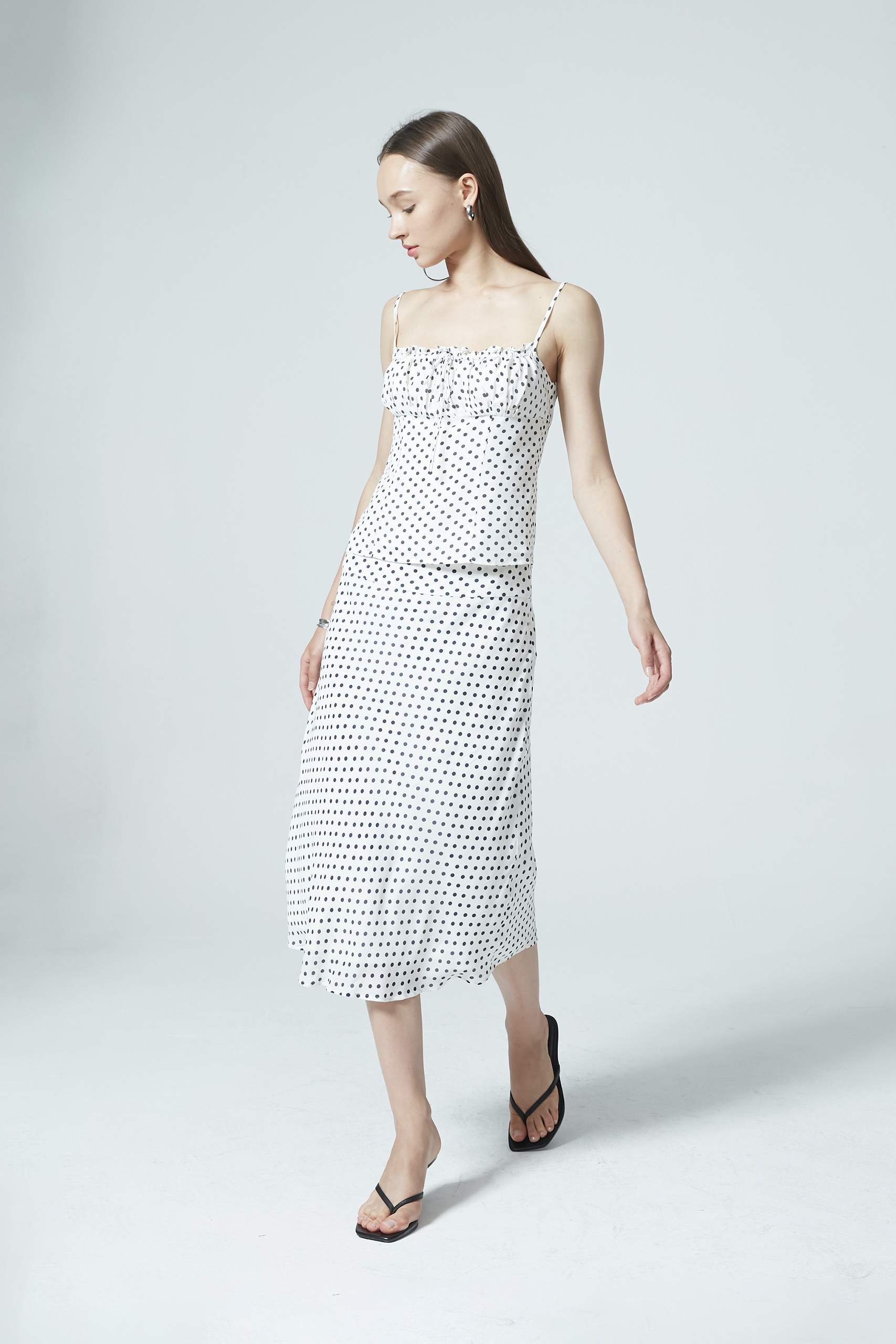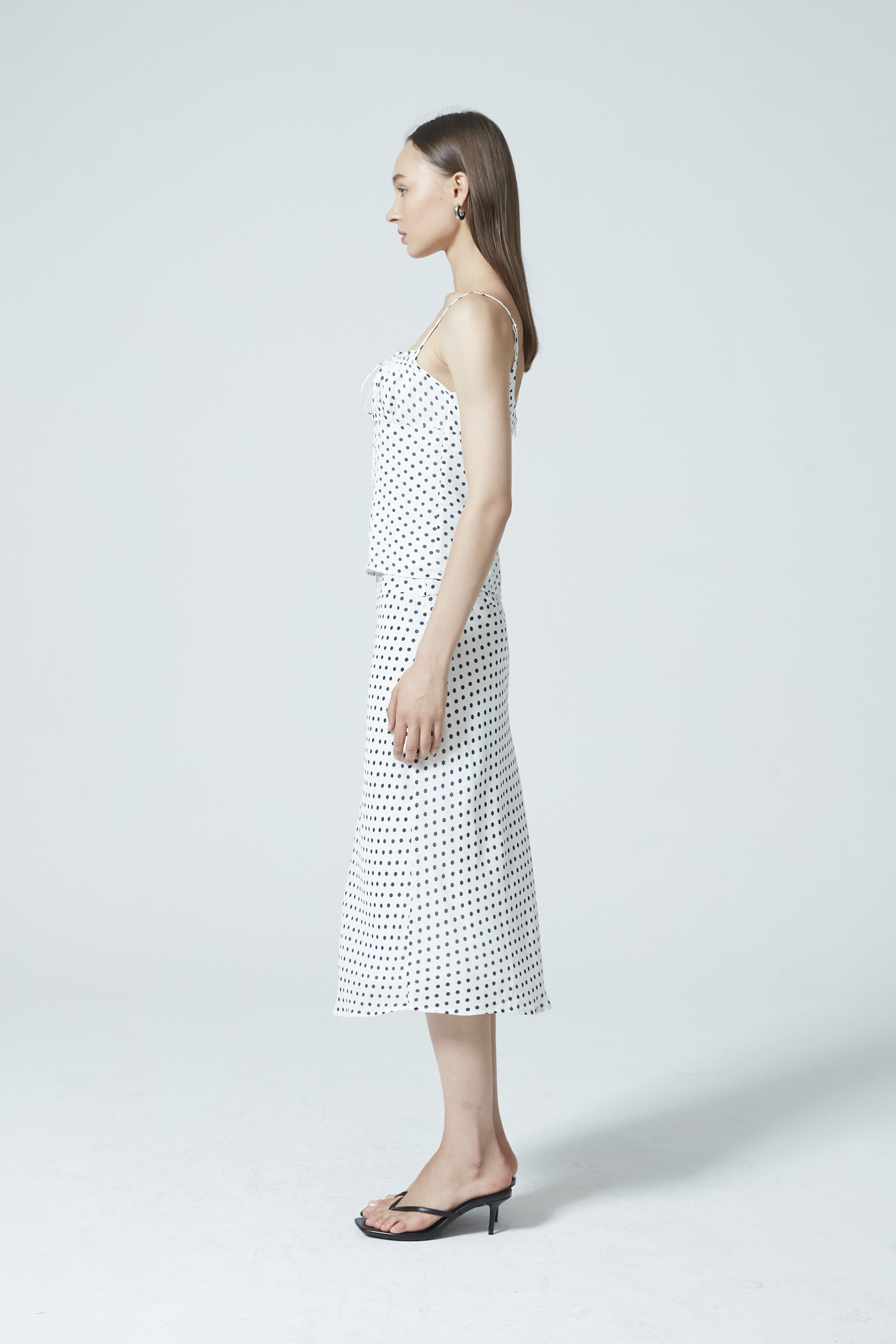 A light and airy skirt featuring a nostalgic pole dot print—this skirt is cut on the bias for a gentle drape and ends at a midi length. An easy piece to match with basics, It is fully lined and has a concealed zipper.