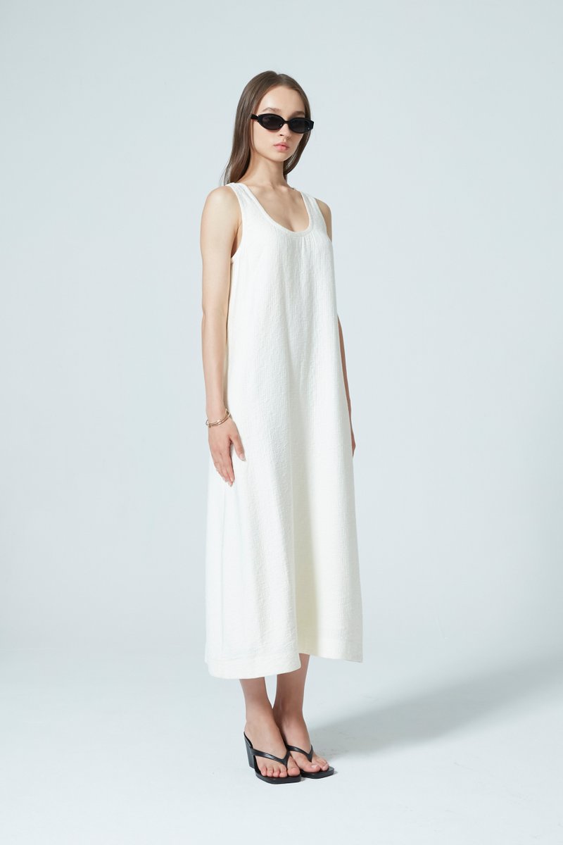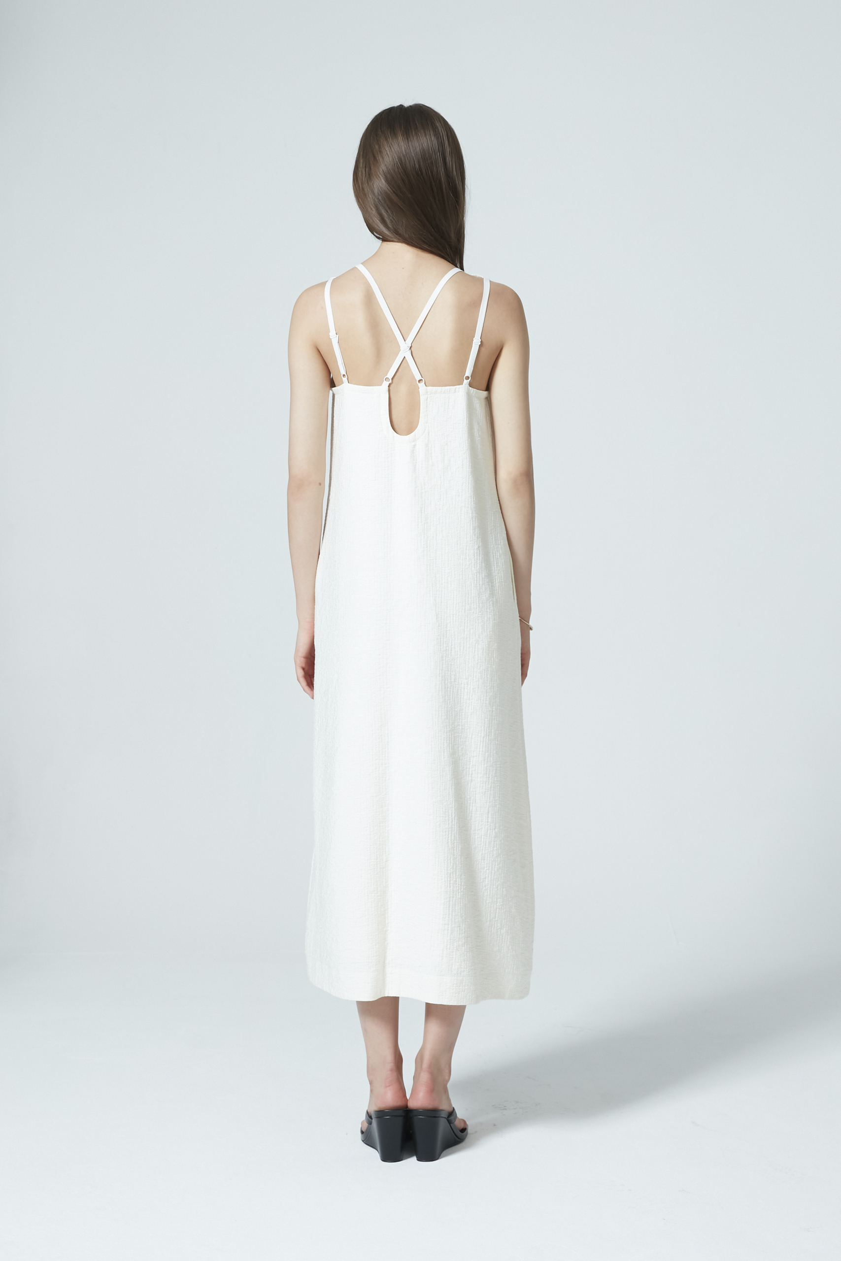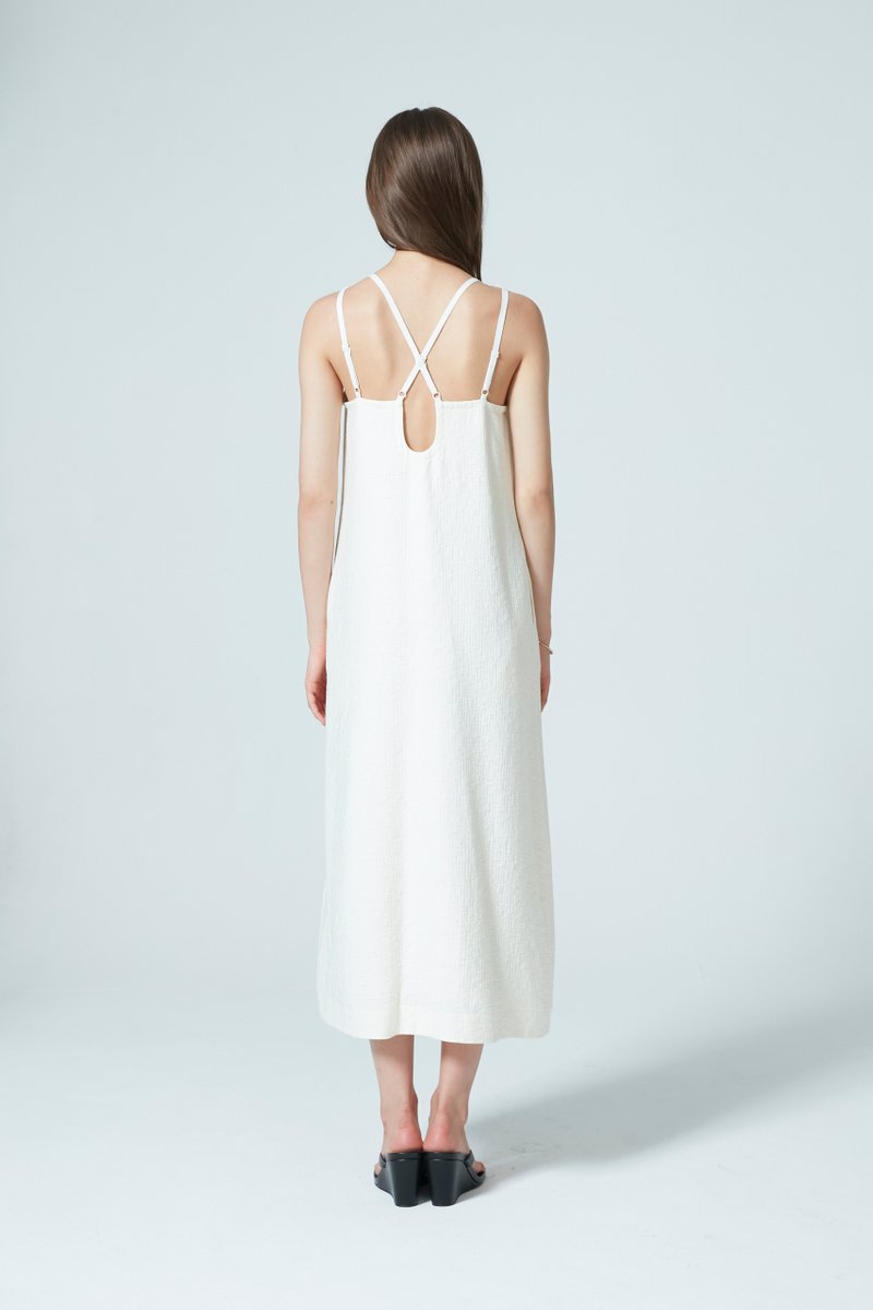 This textured midi dress features unique cross-back straps and a soft crinkled fabric that refines your daily dressing. Cut in a slight a-line silhouette, the dress fits slightly relaxed and moves with you through the day.