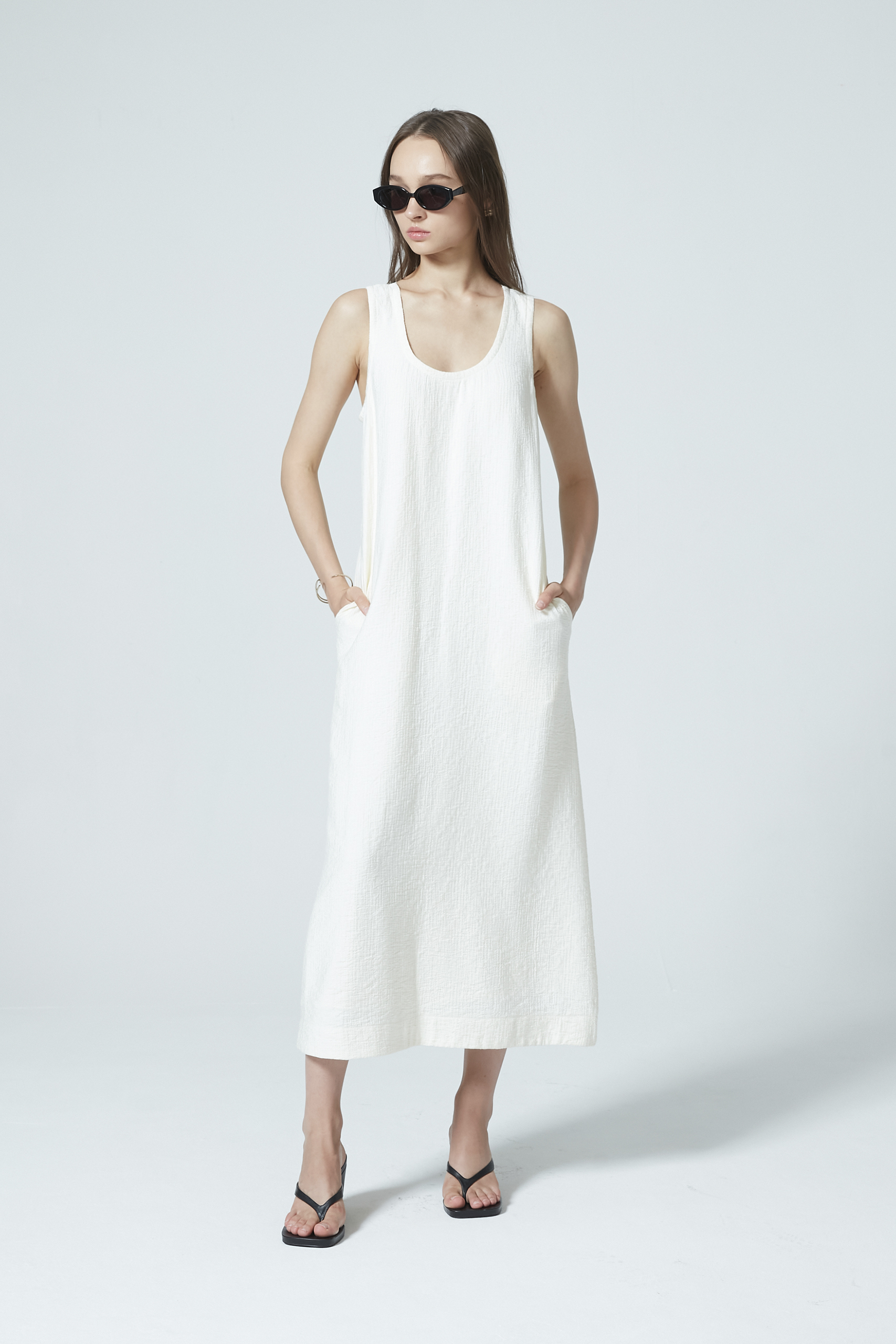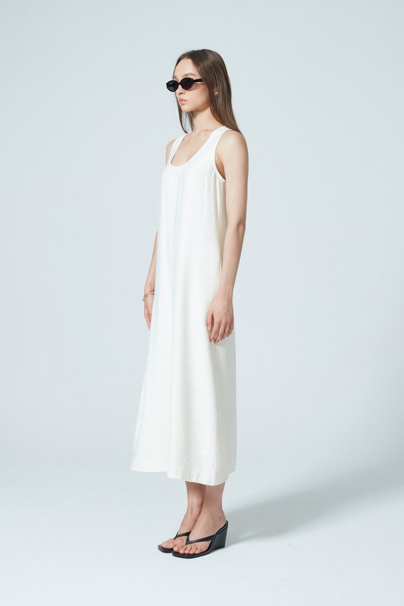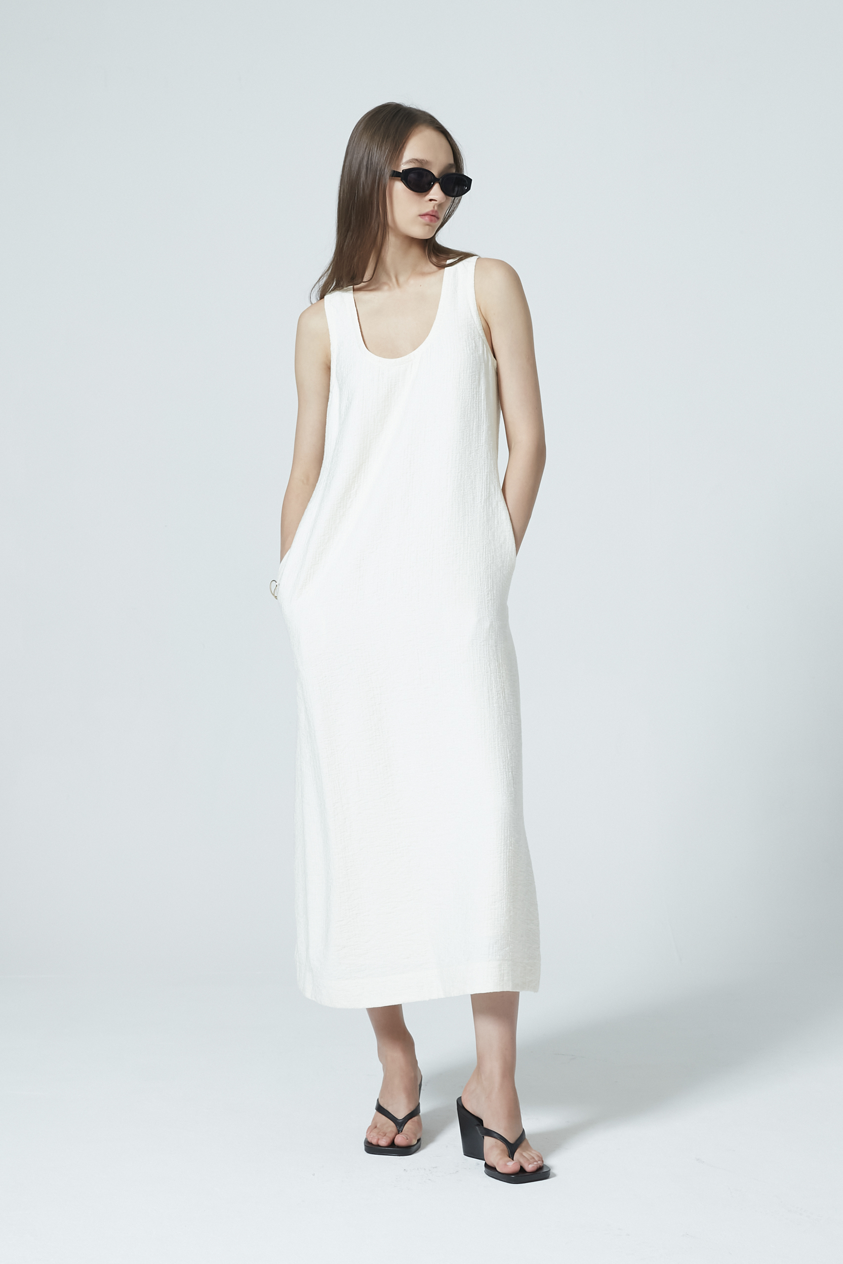 This textured midi dress features unique cross-back straps and a soft crinkled fabric that refines your daily dressing. Cut in a slight a-line silhouette, the dress fits slightly relaxed and moves with you through the day.