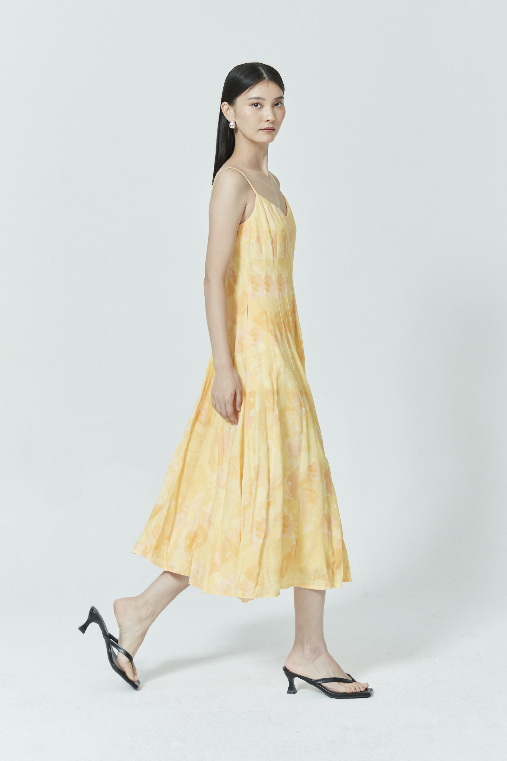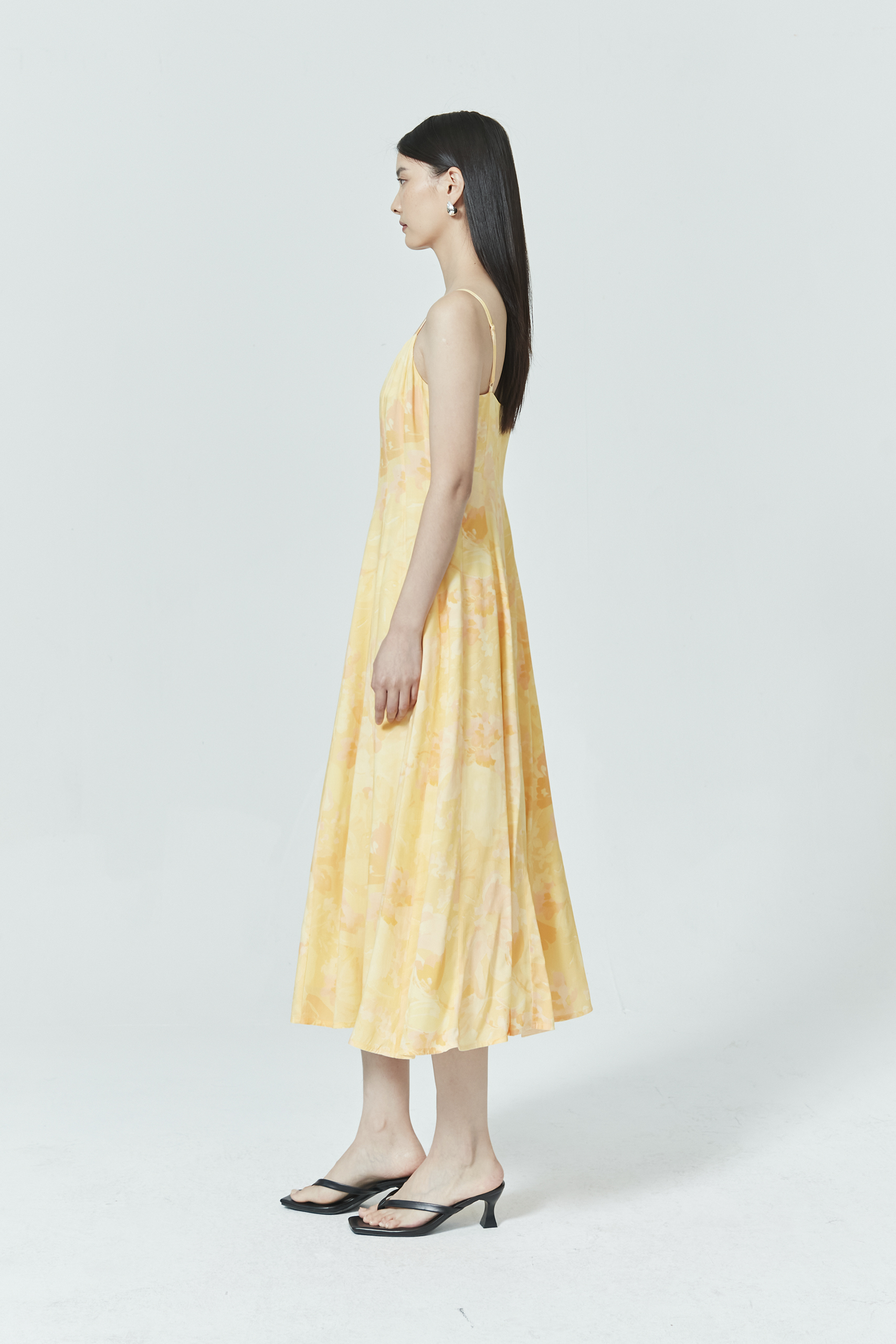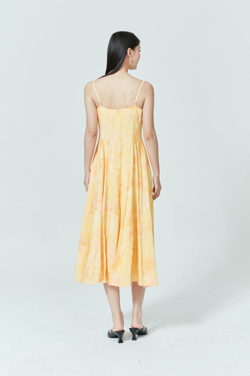 Crafted in a marigold floral print, this flowy midi dress brings a sun-washed warmth to a timeless silhouette. An easy yet elegant piece for day-to-evening dressing.
