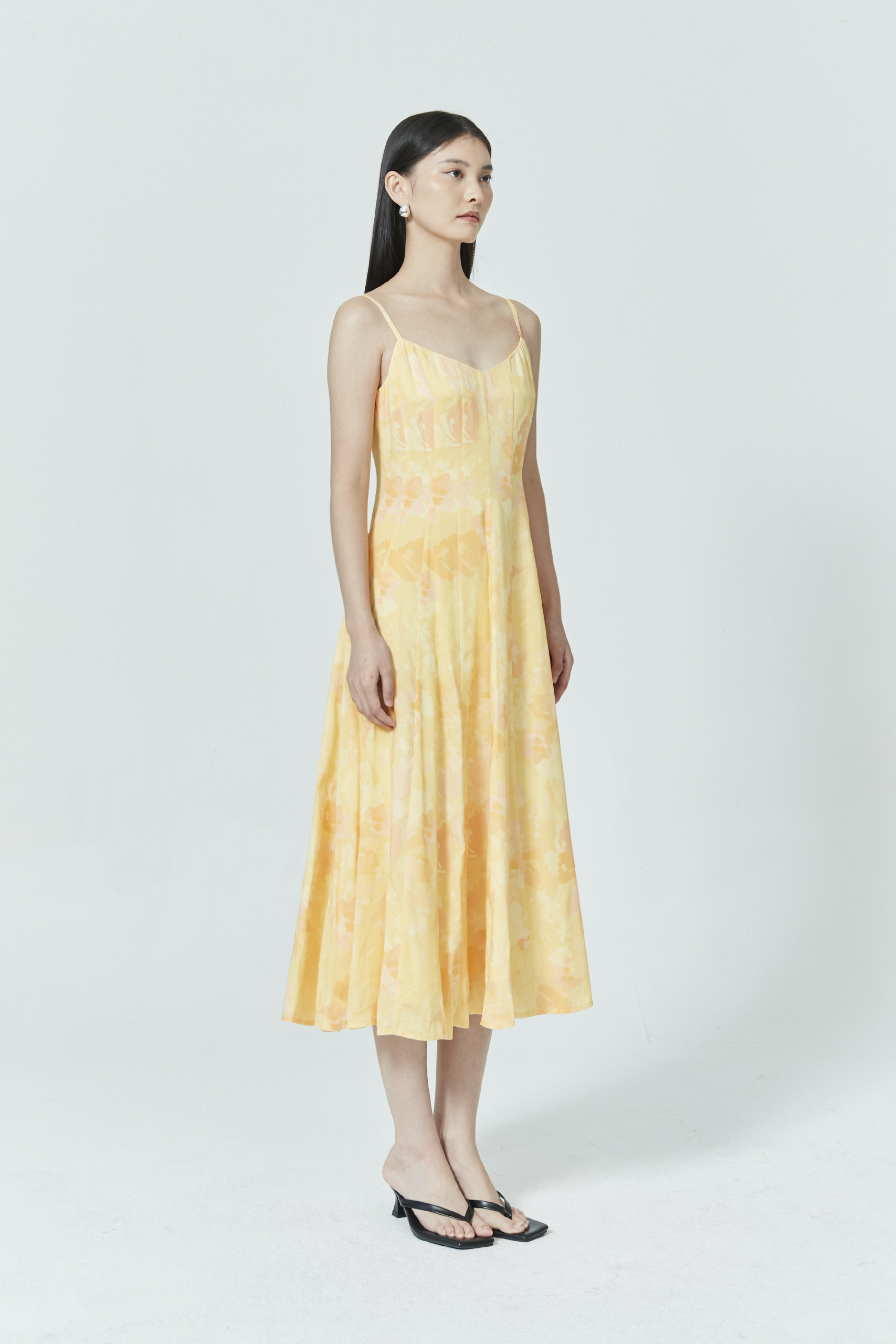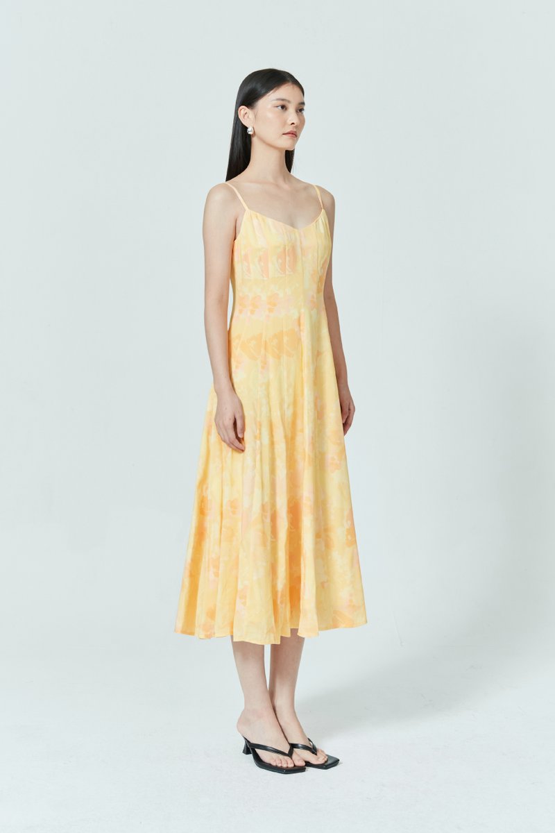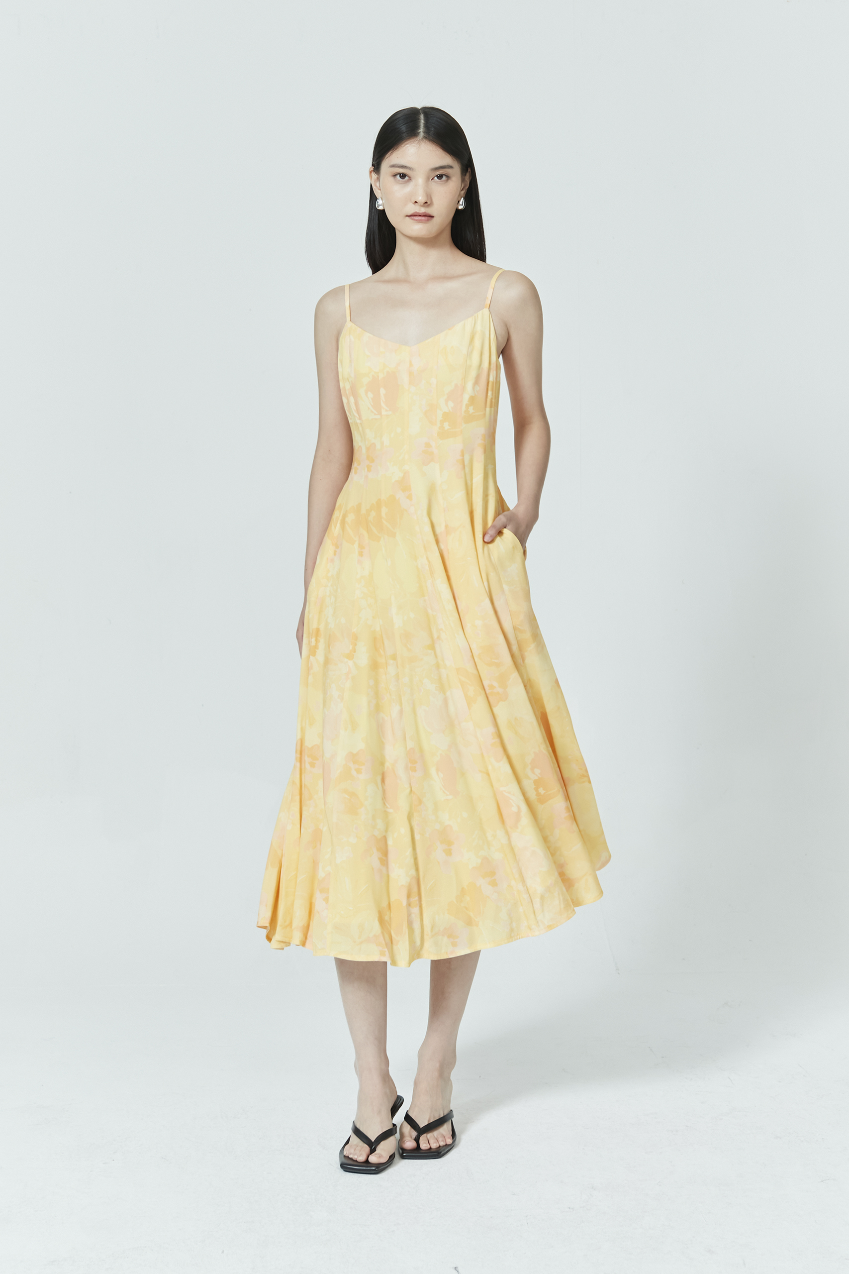 Crafted in a marigold floral print, this flowy midi dress brings a sun-washed warmth to a timeless silhouette. An easy yet elegant piece for day-to-evening dressing.
