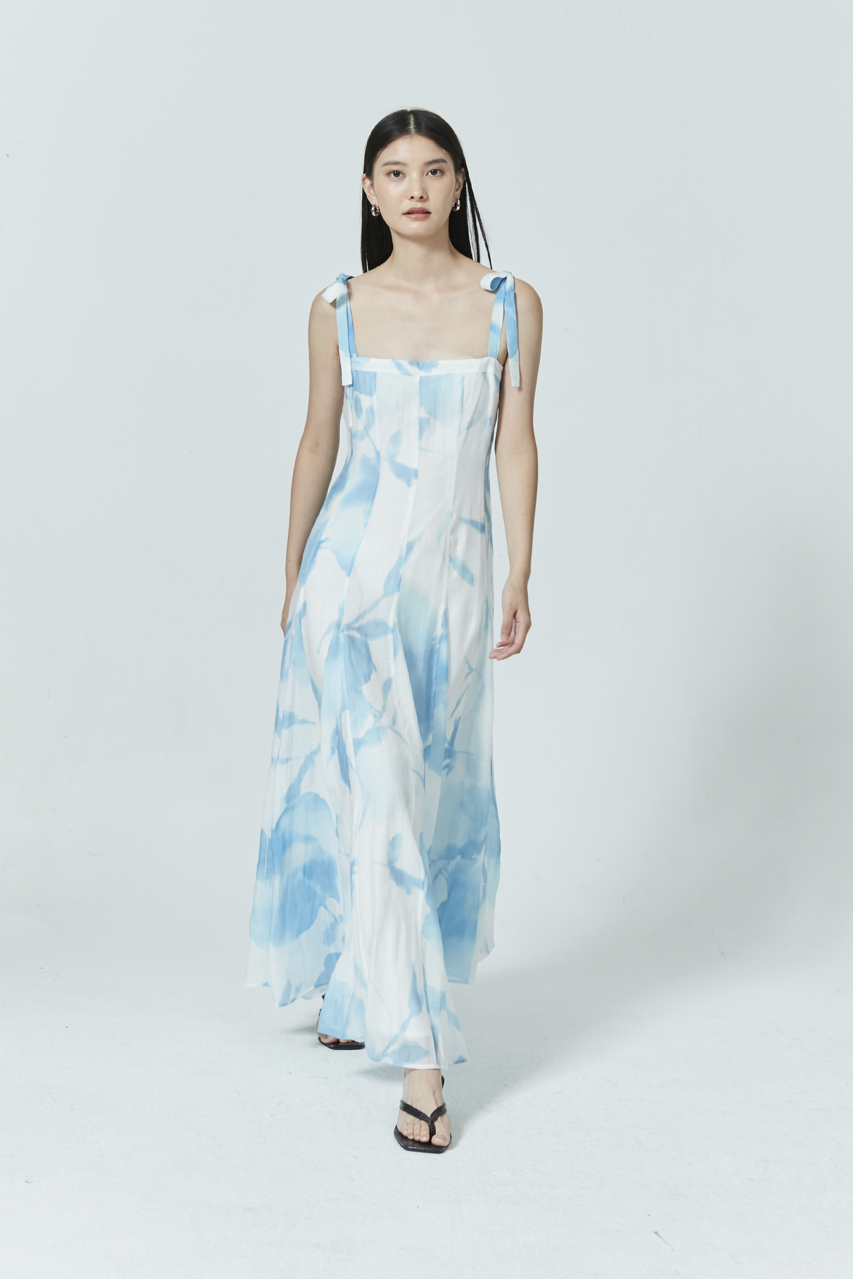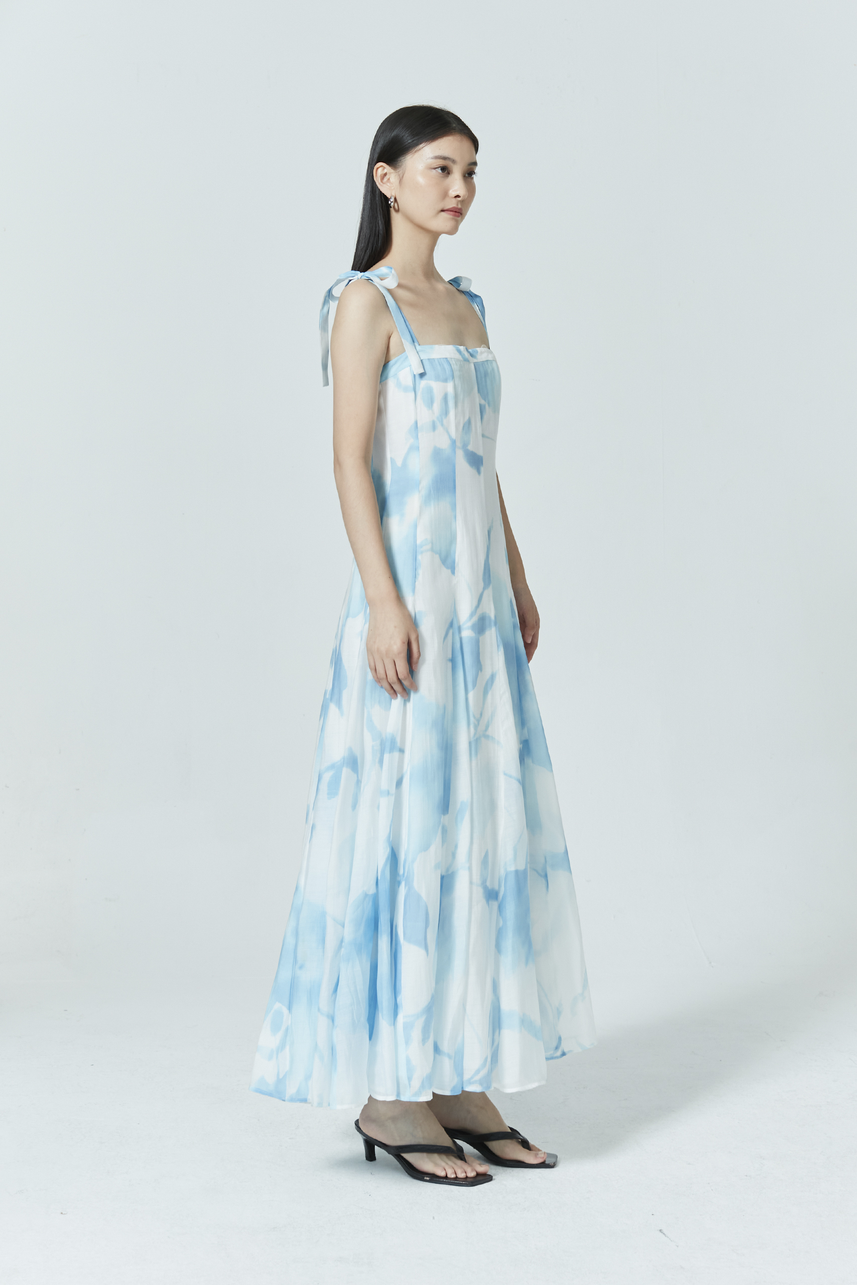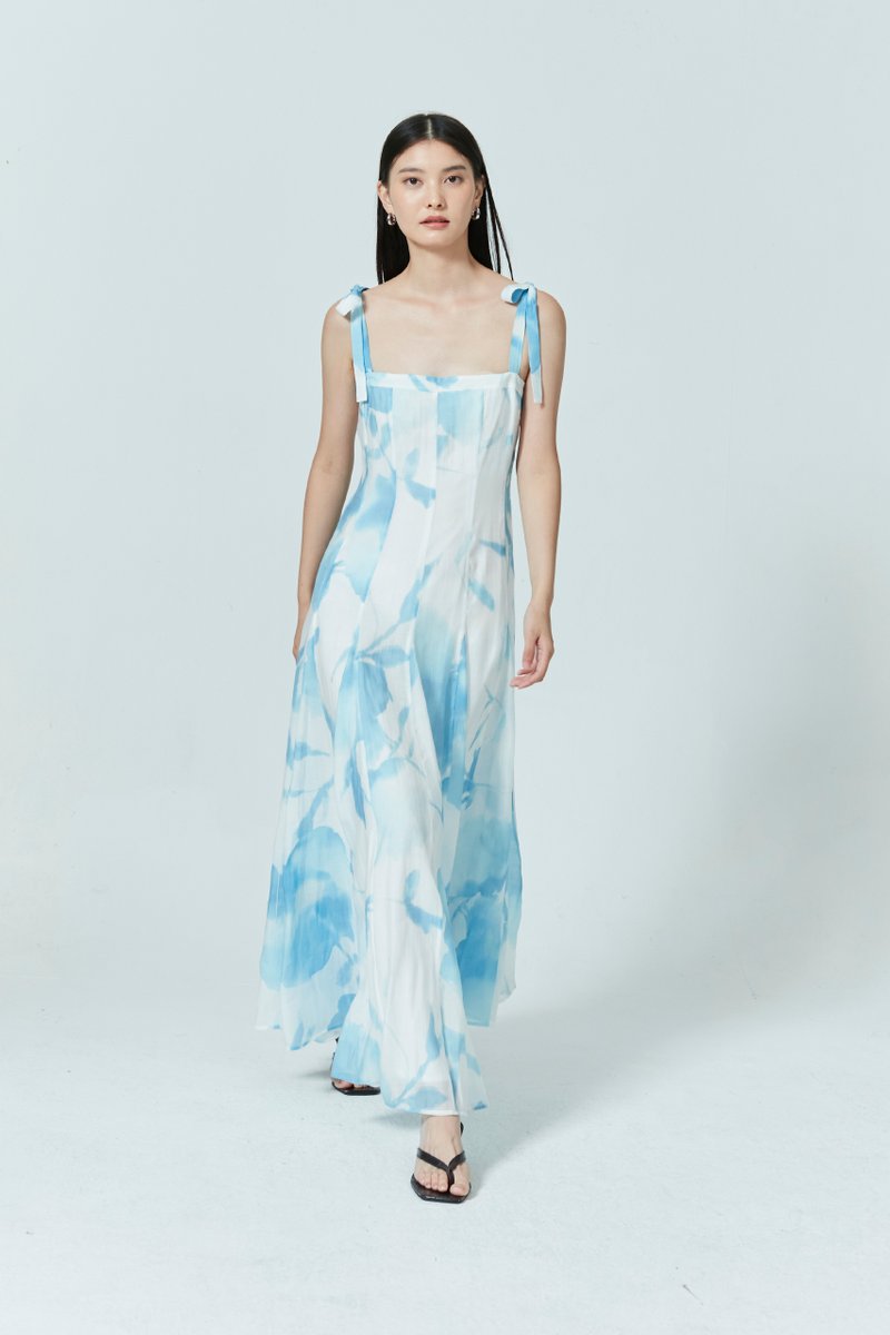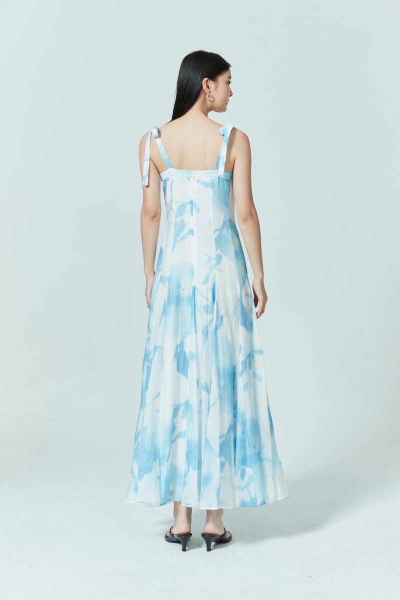 Reminiscent of blue skies and sunny days, this paneled dress features a soft, flowing silhouette that moves with you. Self-tie straps add a touch of femininity and adjustability, suiting your preferences. Fully lined for comfort and ease.