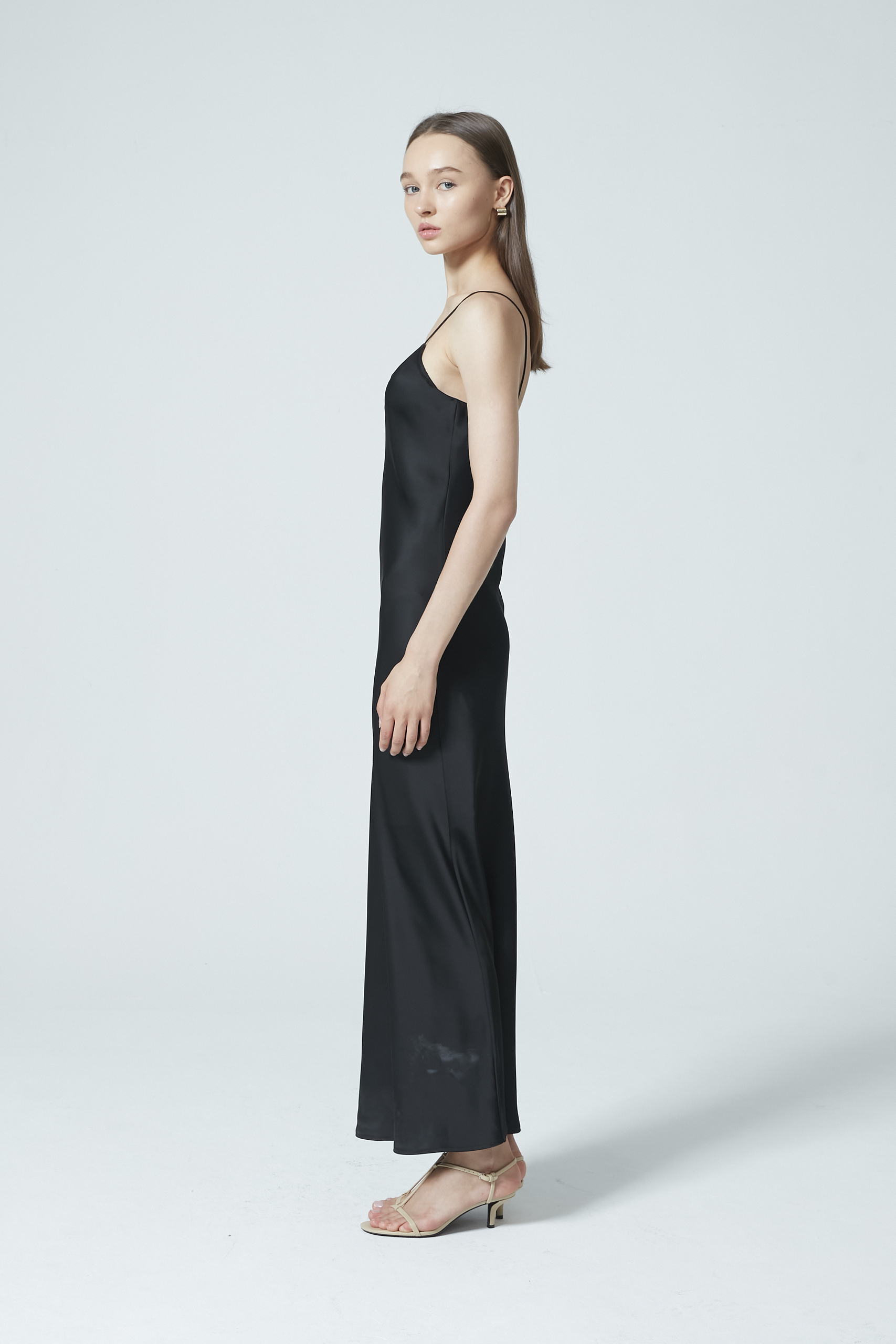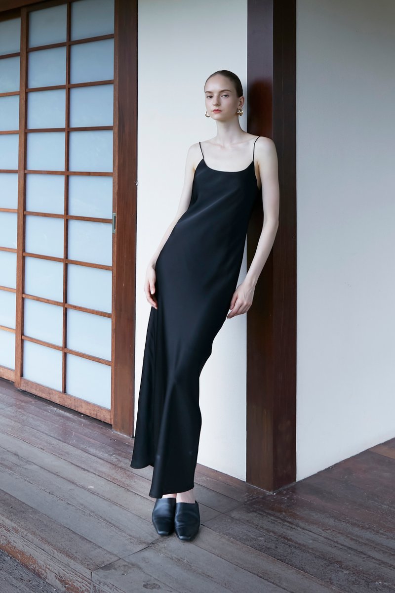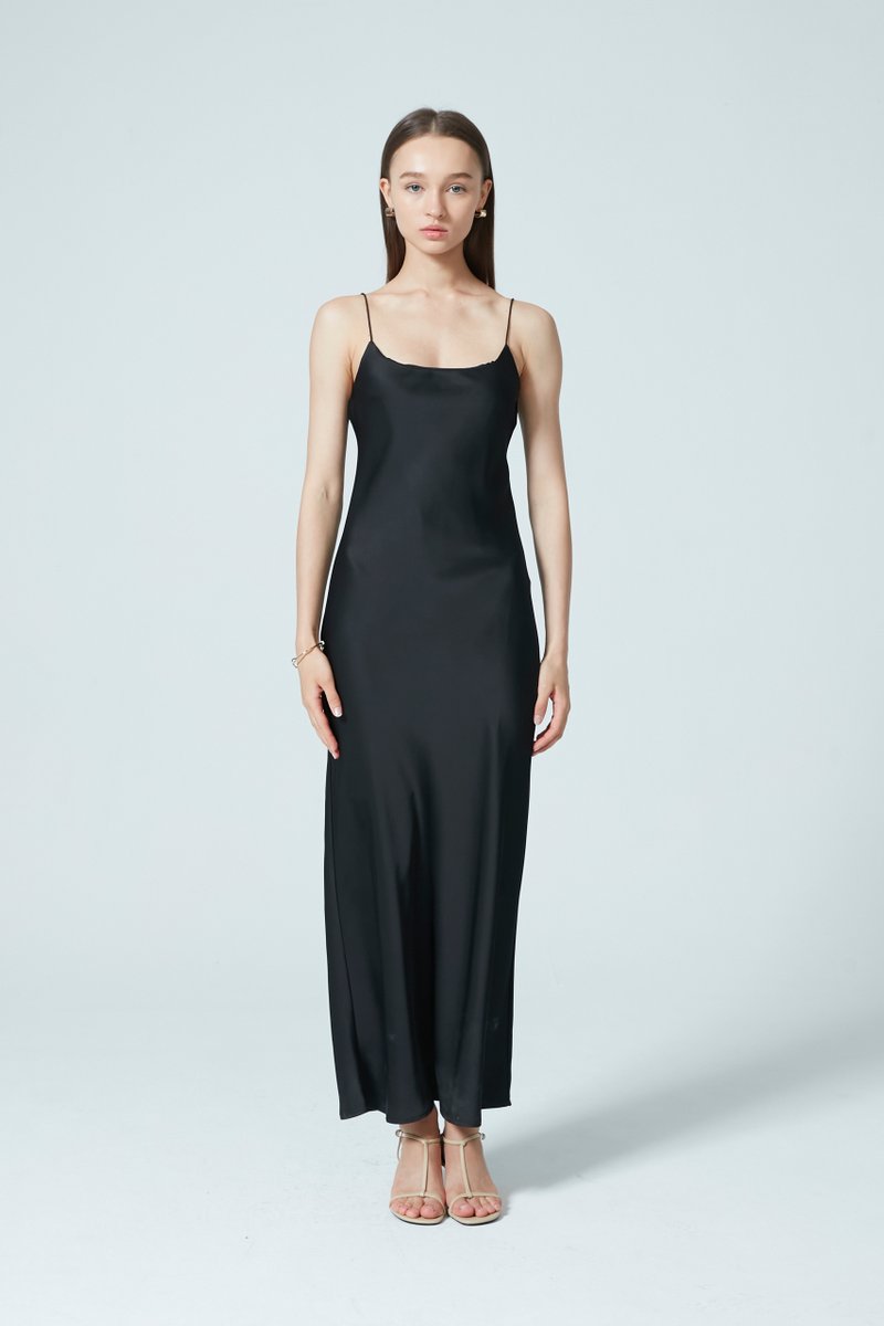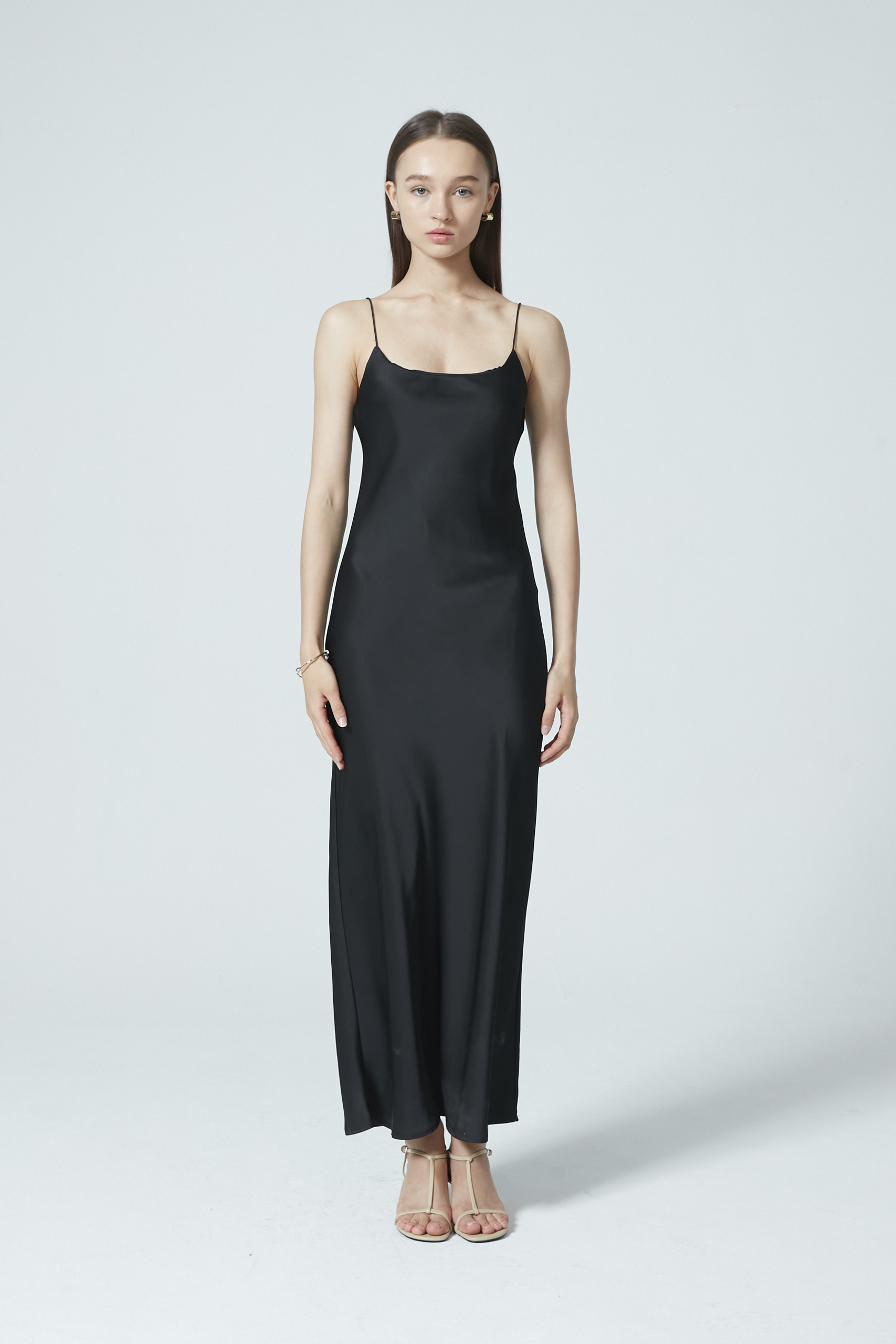 Sleek, classic, and timeless—this satin dress is the epitome of elegance. Cut at a flattering maxi length and a relaxed silhouette, the dress drapes beautifully with a fluid, graceful finish.