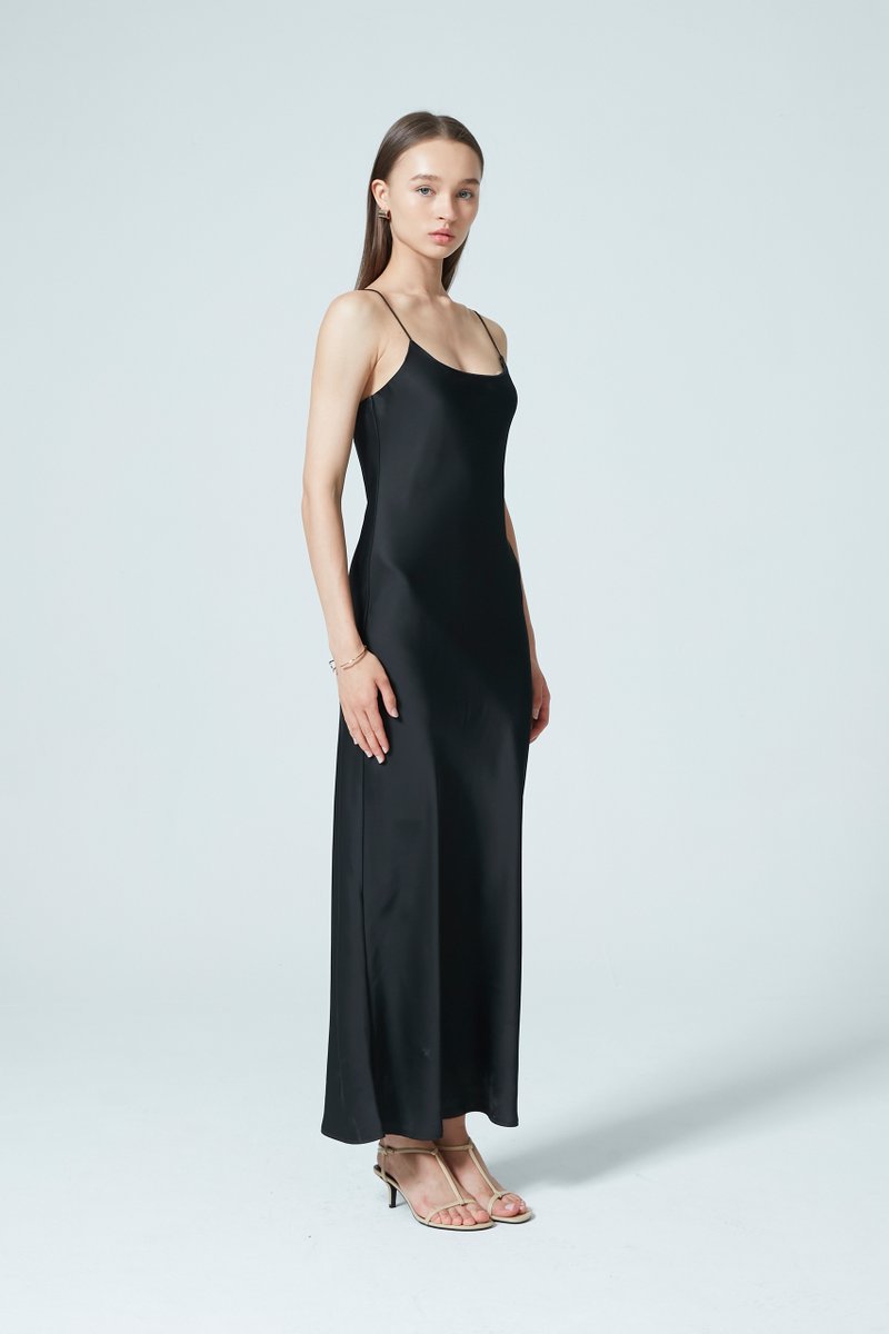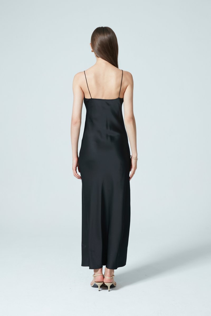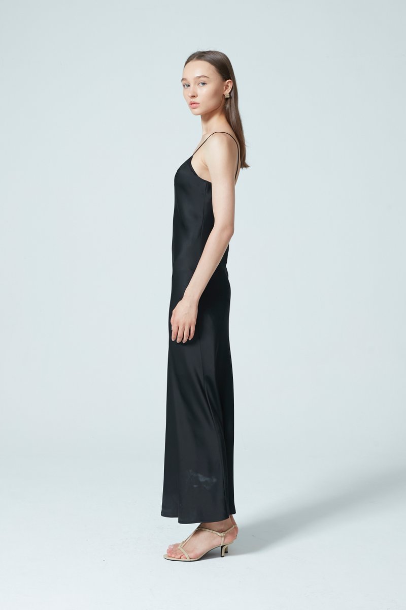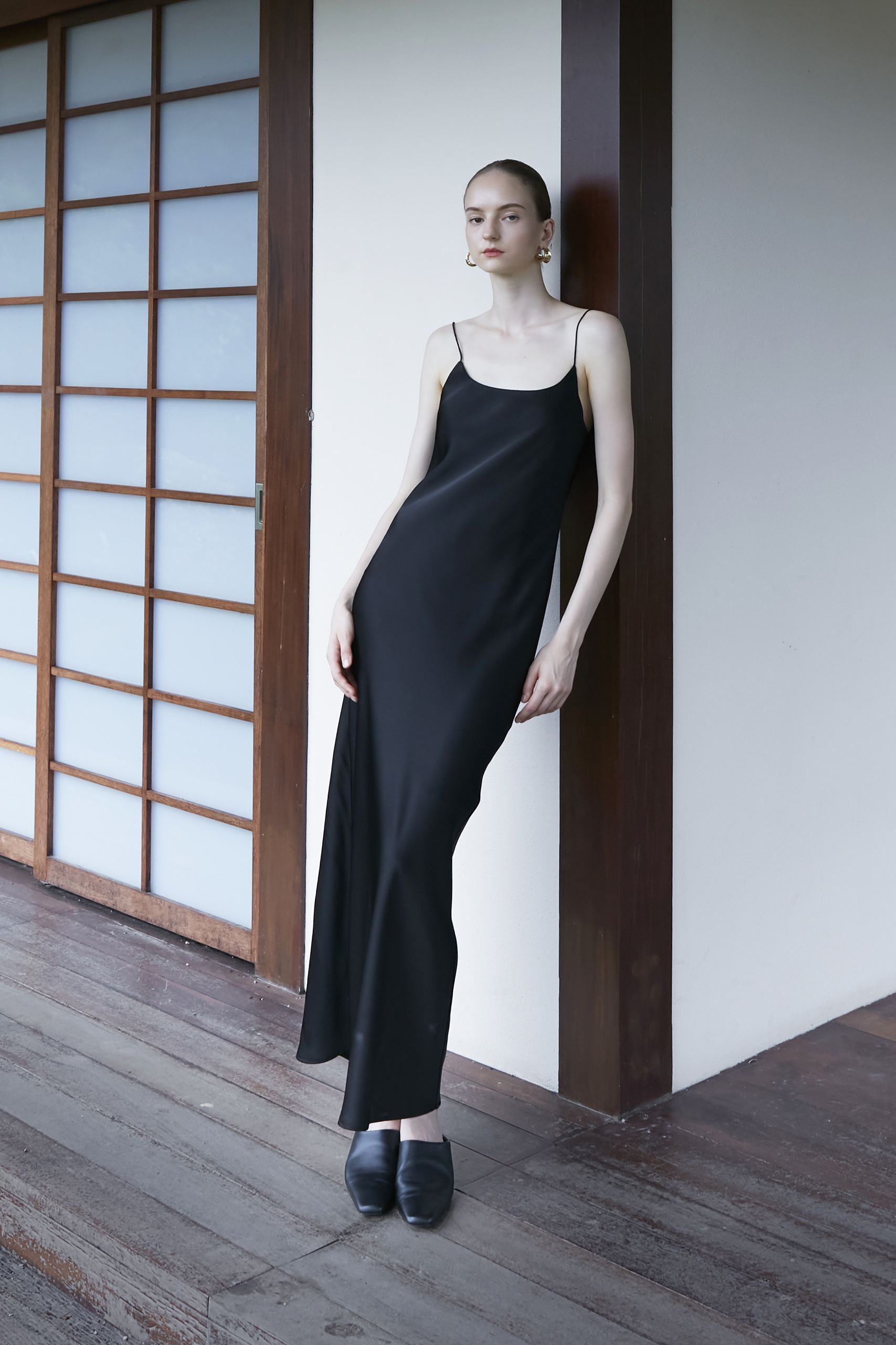 Sleek, classic, and timeless—this satin dress is the epitome of elegance. Cut at a flattering maxi length and a relaxed silhouette, the dress drapes beautifully with a fluid, graceful finish.