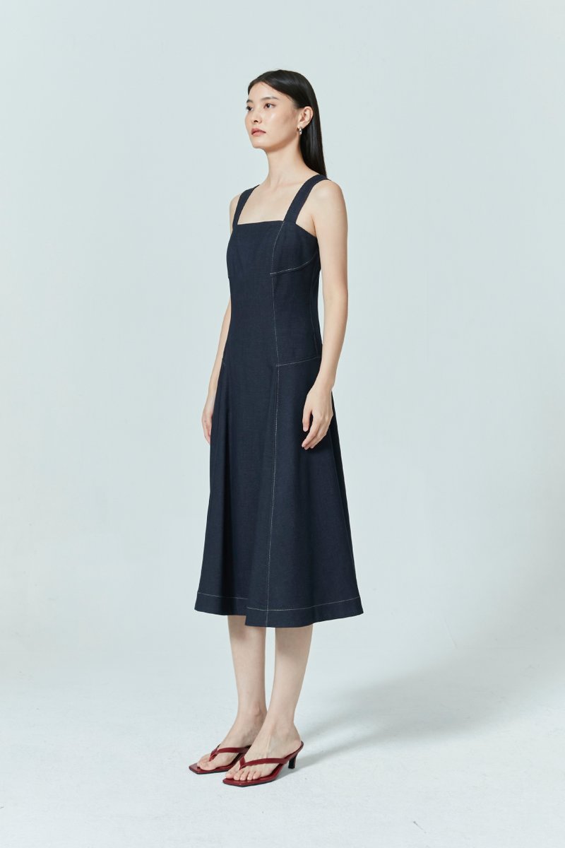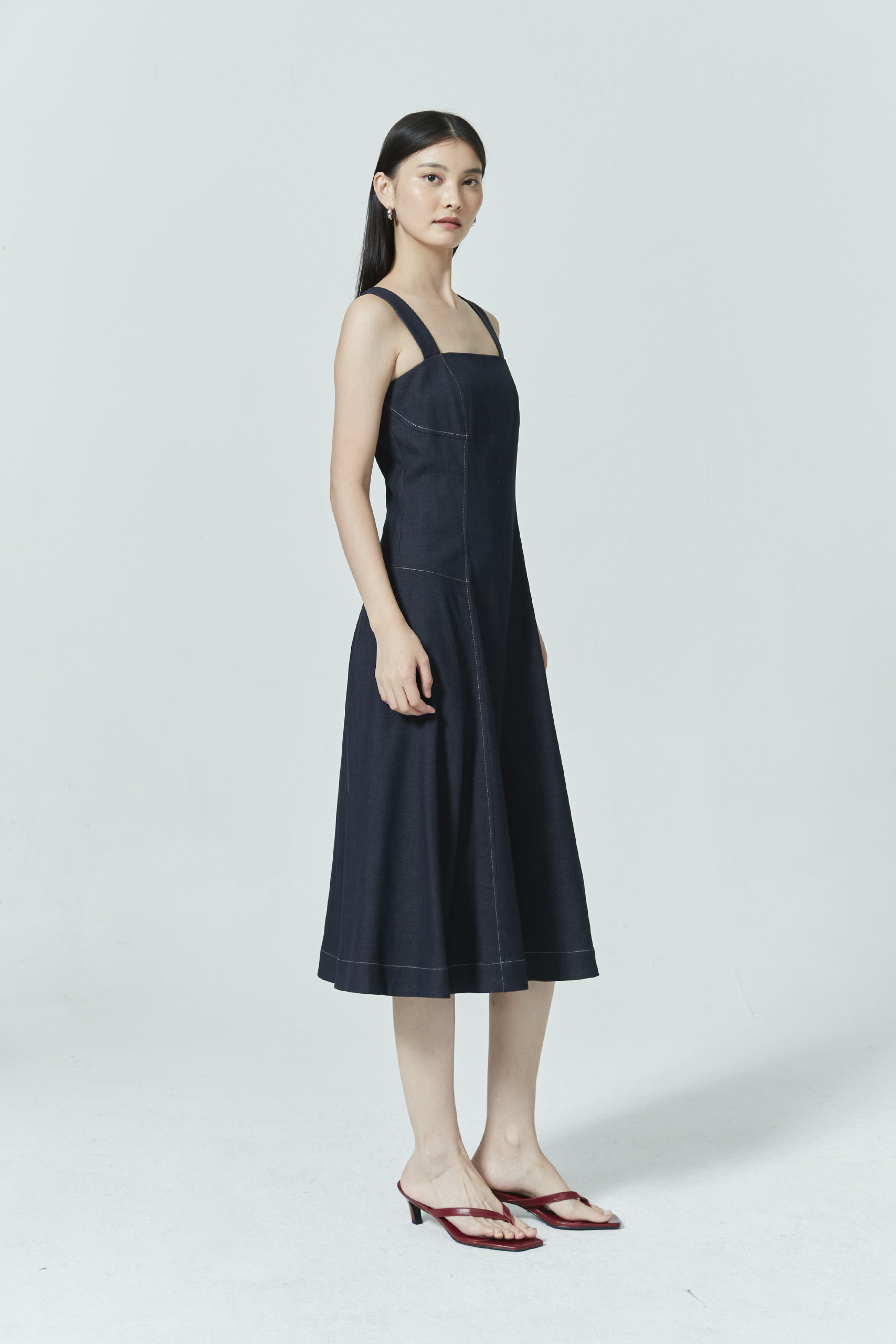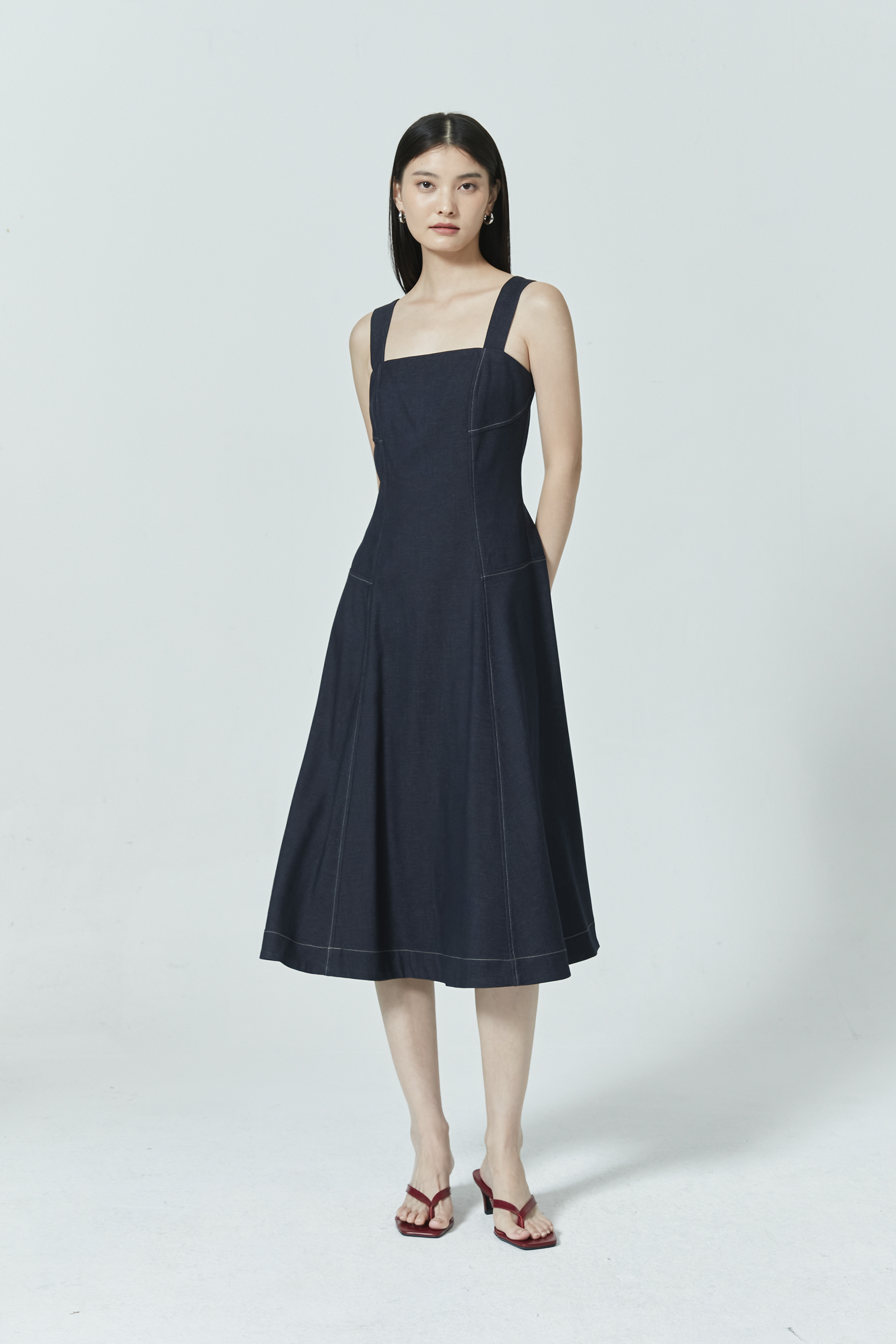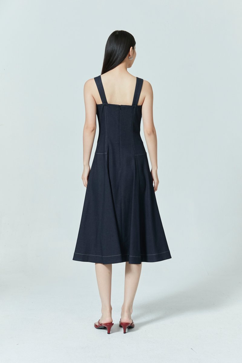 Crafted in stretch denim, this sleeveless midi dress offers a refined take on an everyday classic. Easy to style up or down, it’s a timeless staple you’ll reach for season after season.