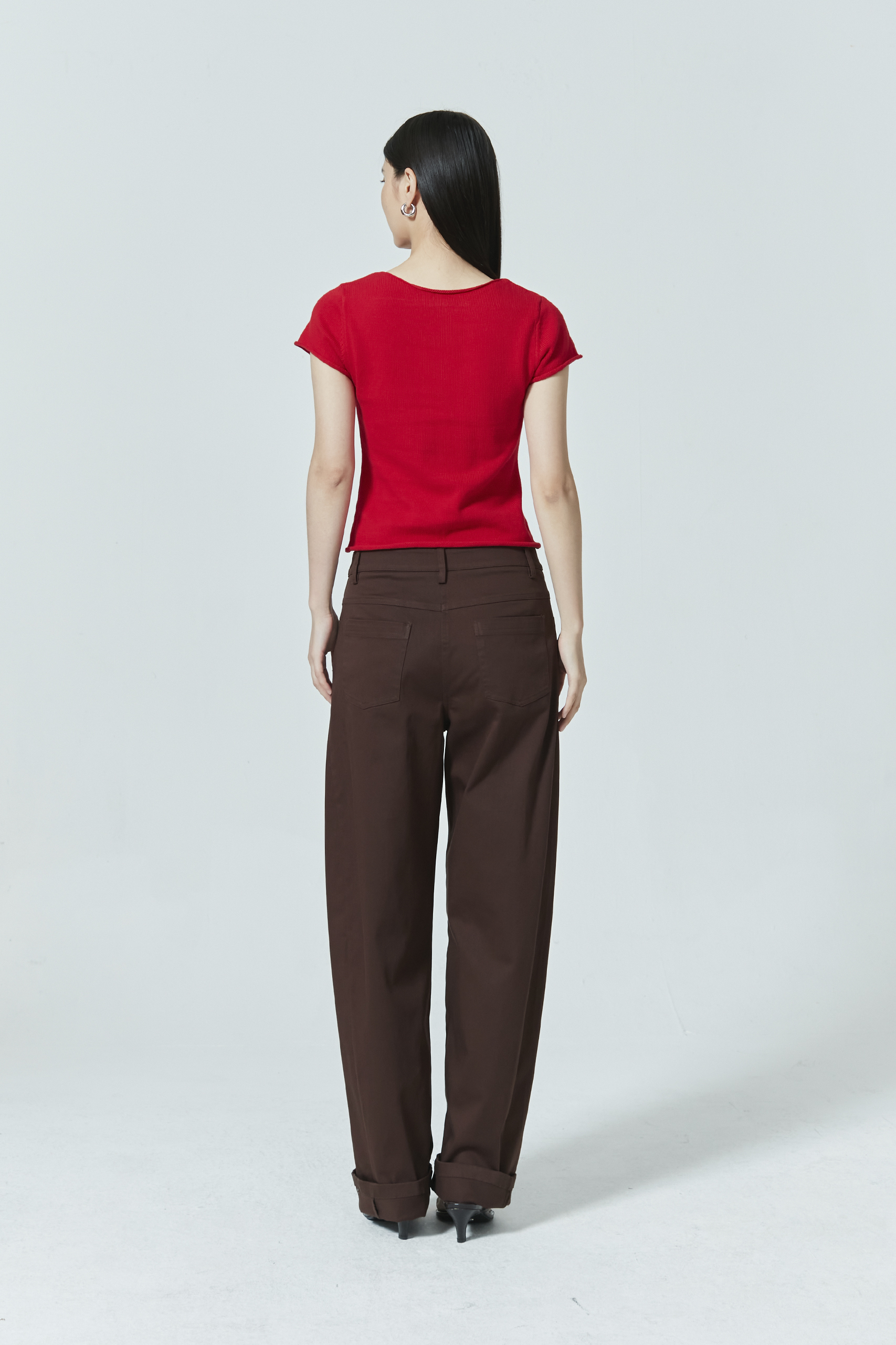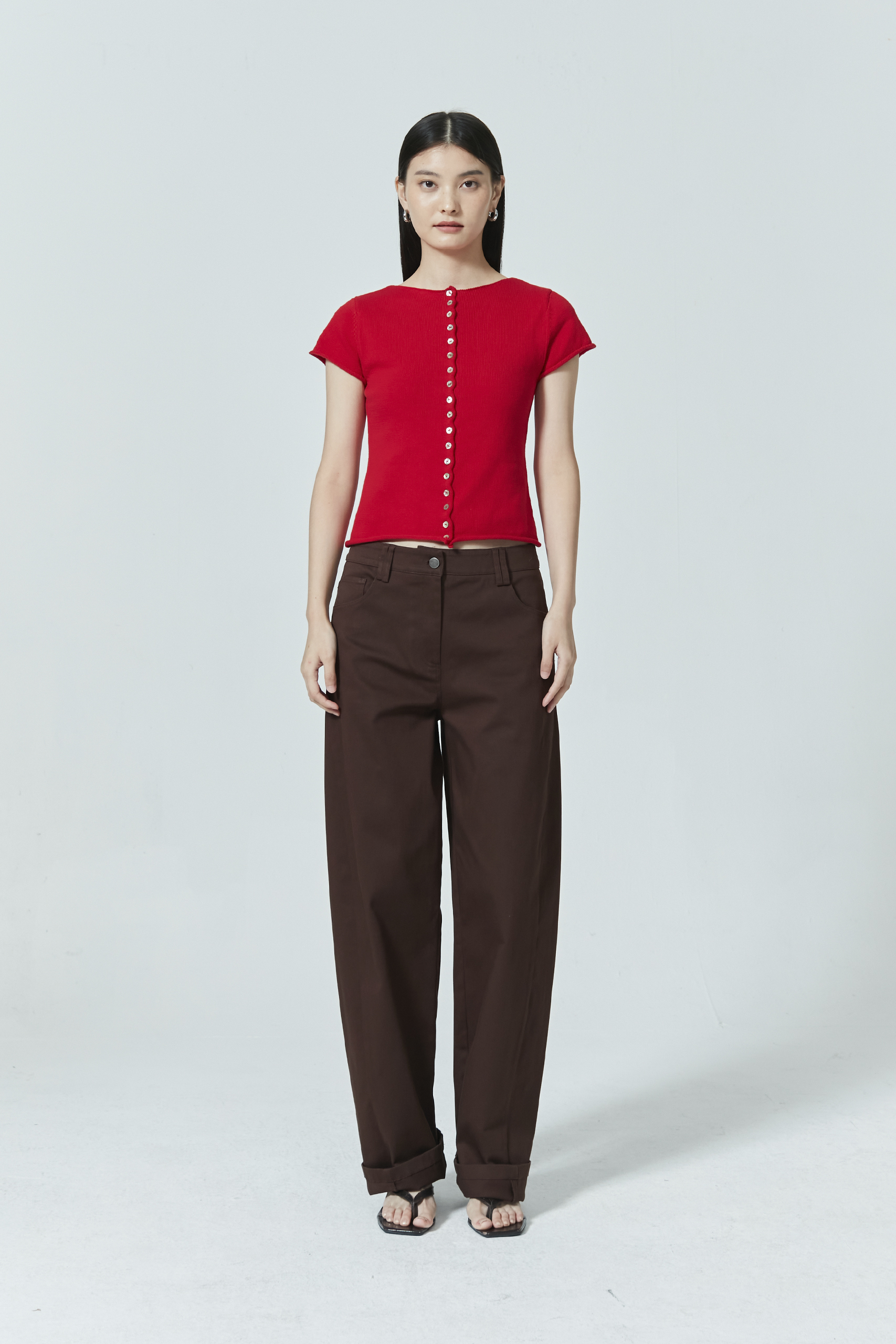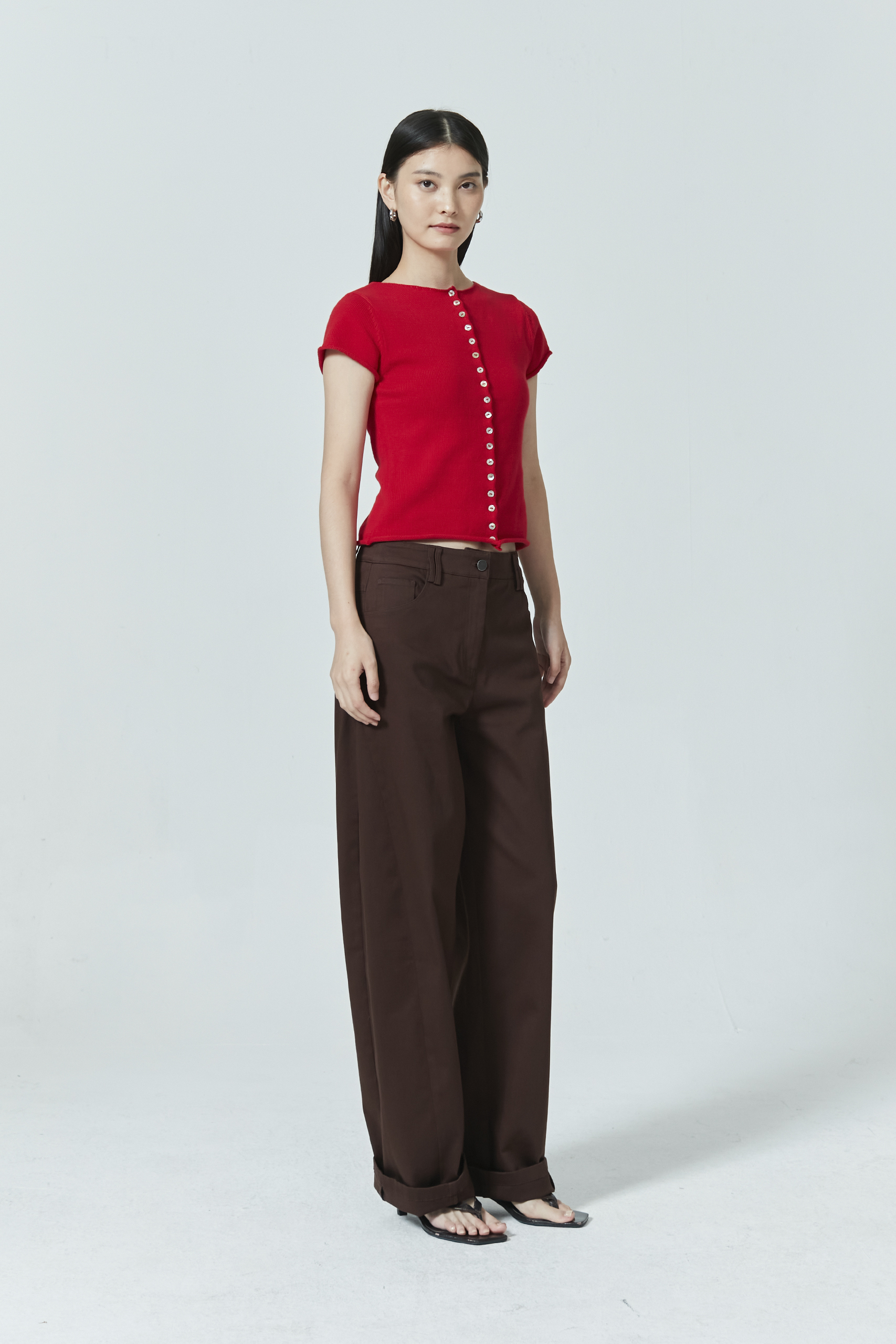Small shell buttons line this knitted crop top, a simple yet eye-catching design. Customise your look by unbuttoning a few buttons at the top or bottom—and find yourself a new look!