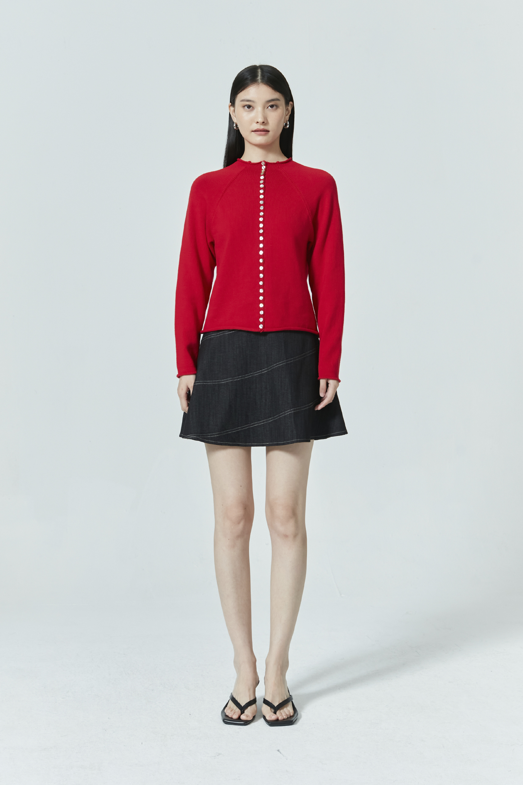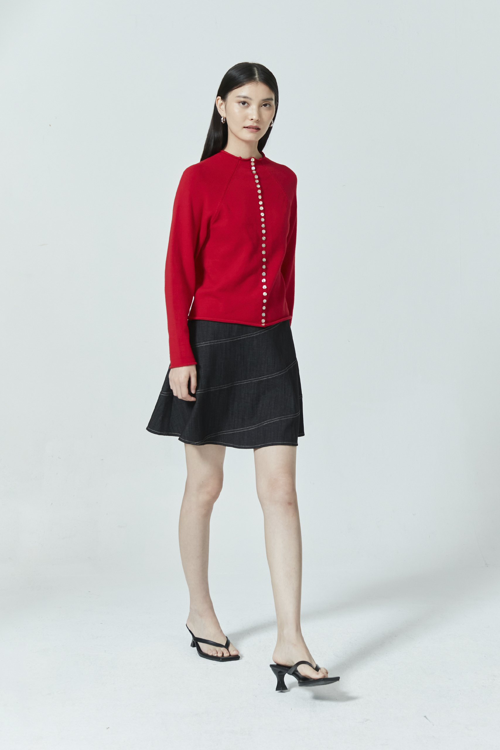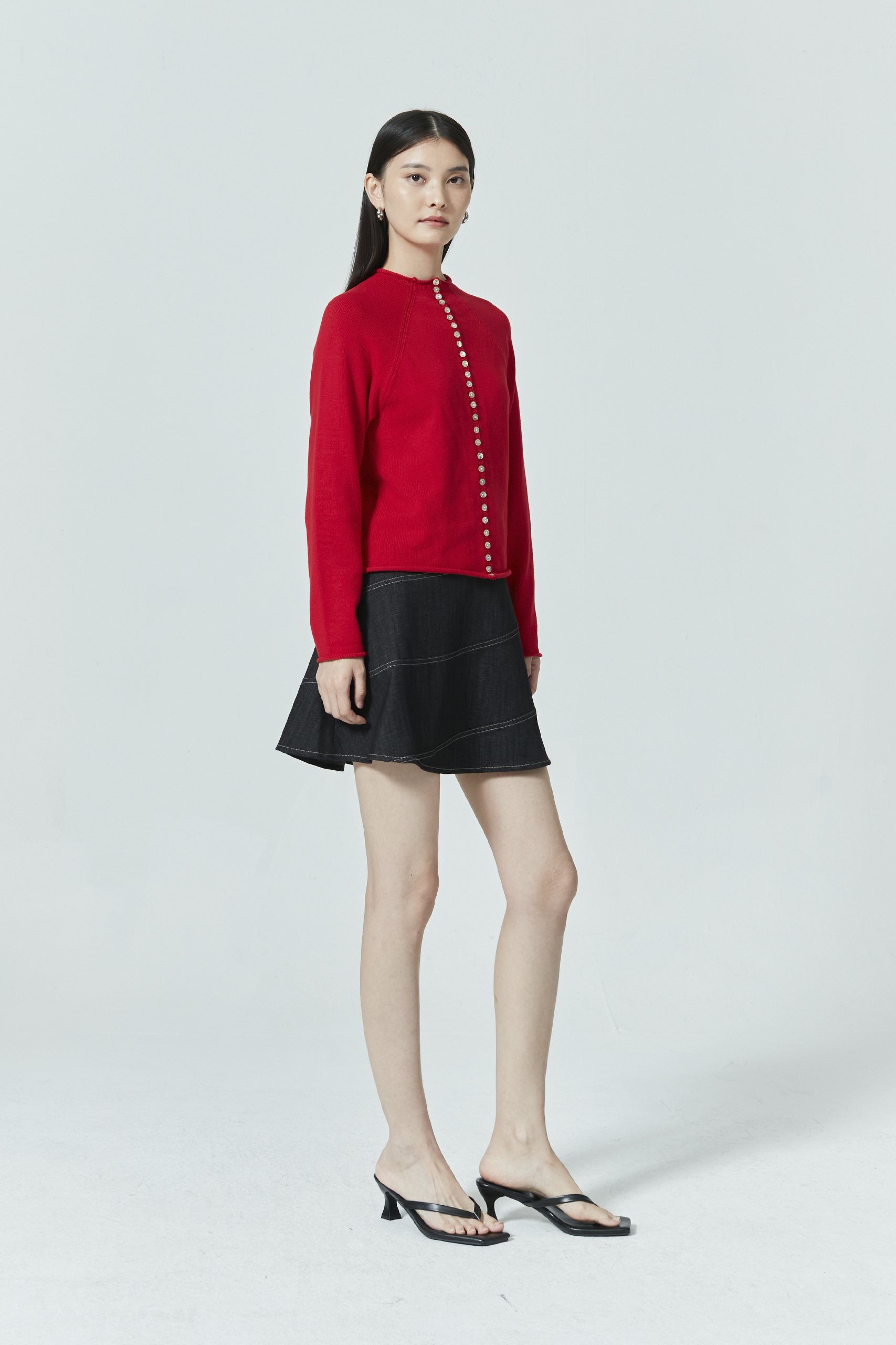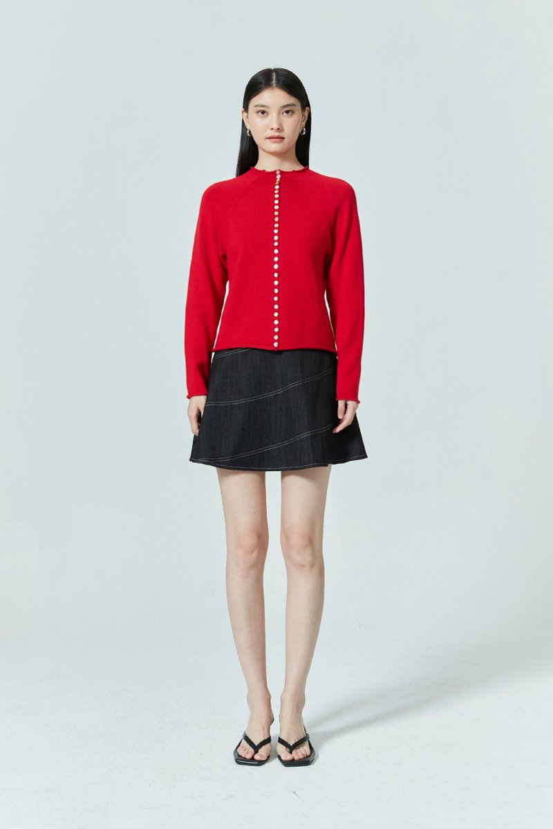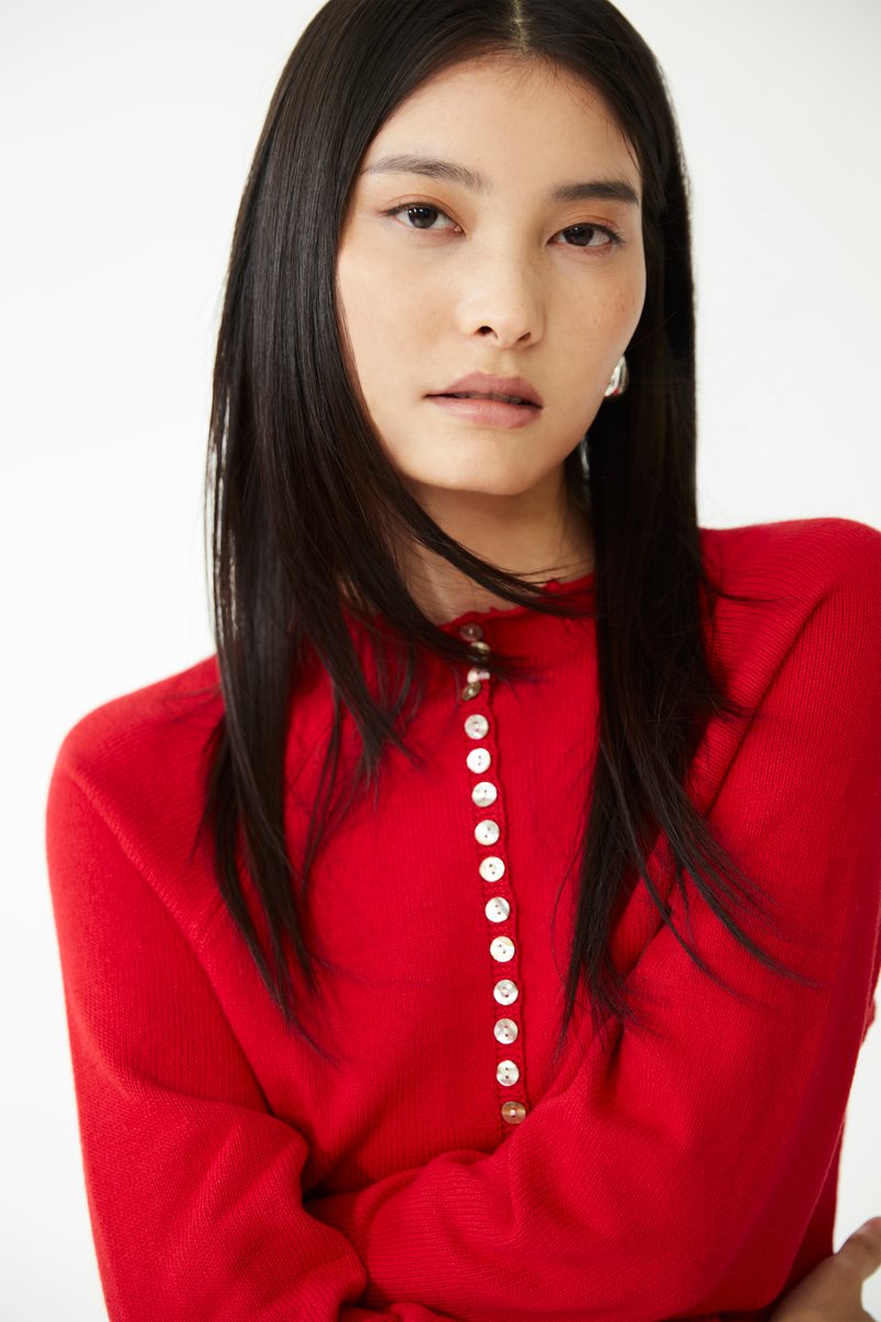 An elevated version of the everyday cardigan—this long sleeve knit top features a unique high neck and button front, perfect for layering or wearing on its own. Pair with tailored bottoms for a chic statement look or style with shorts for a casual off-duty fit.