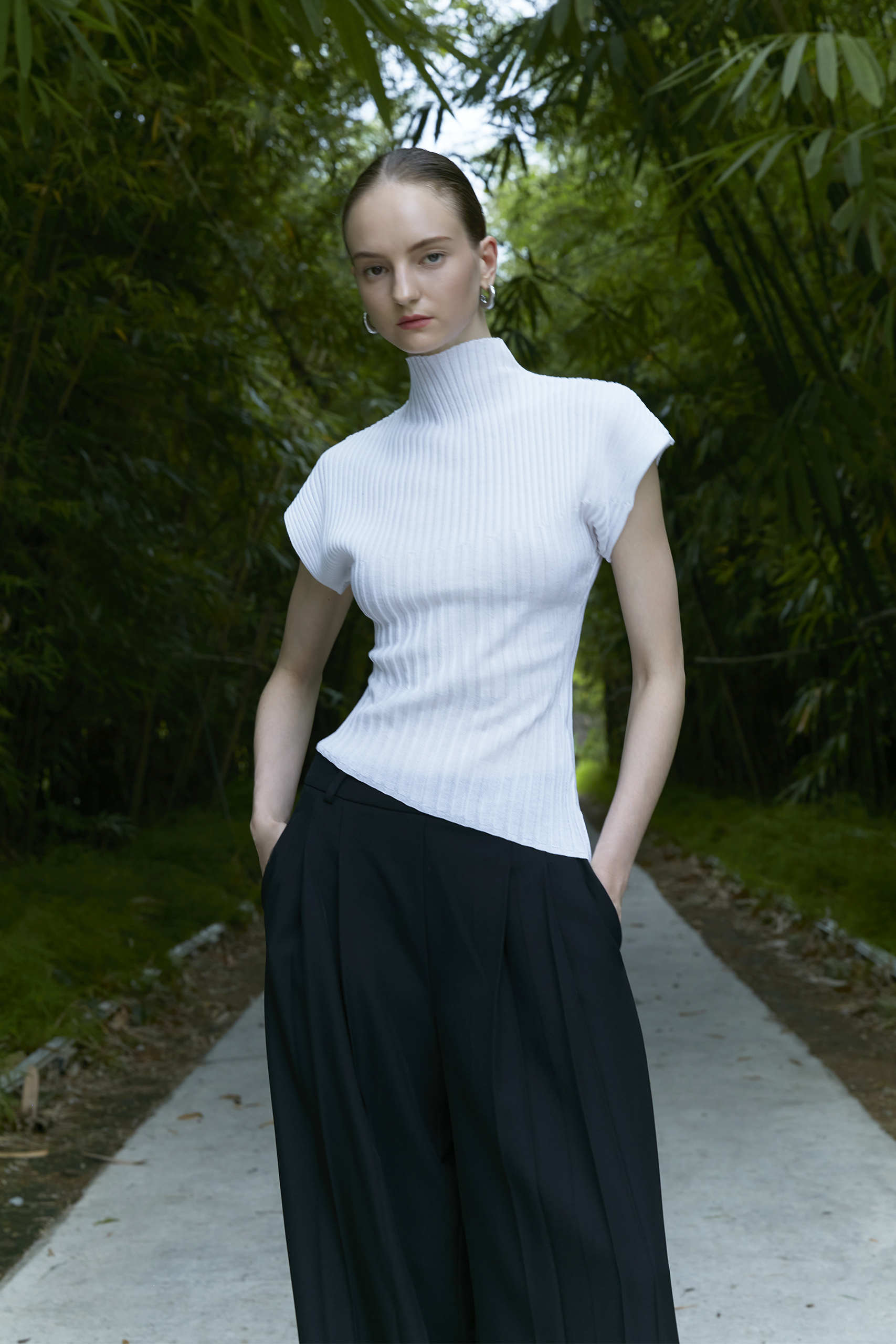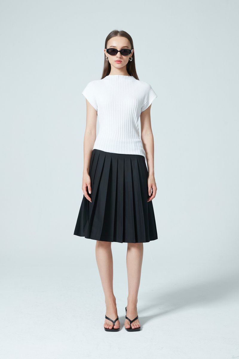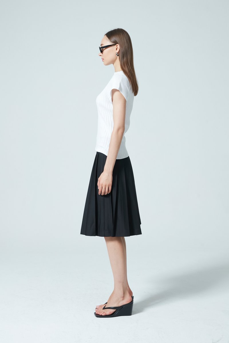 Playing with structure and fluidity, this knit top was designed with a stretchy ribbed knit that provides a refreshed silhouette. The cap sleeves and mock neck elevate the look with a modern, refined touch.