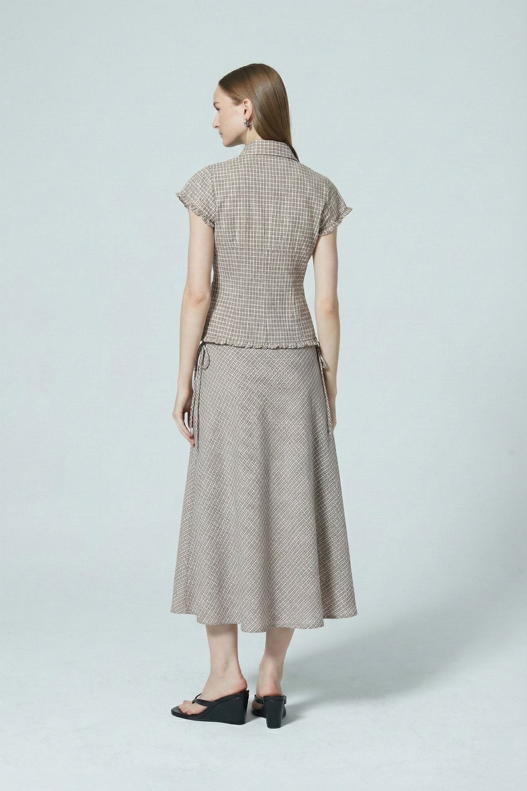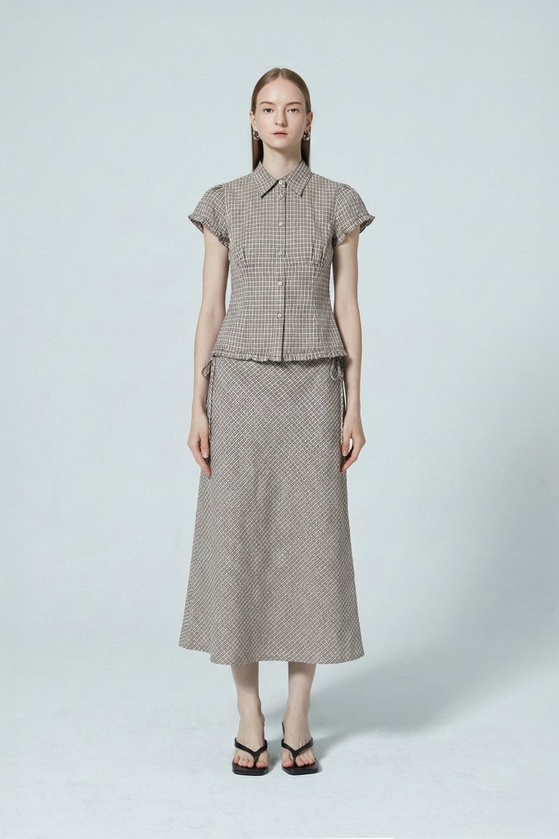 Lean into your fun and preppy side with this checkered shirt. Featuring frill details on the sleeve and hem, as well as small shell buttons for a slight shimmer. Pair with its matching skirt or opt for a plain pair of bottoms for an understated look.