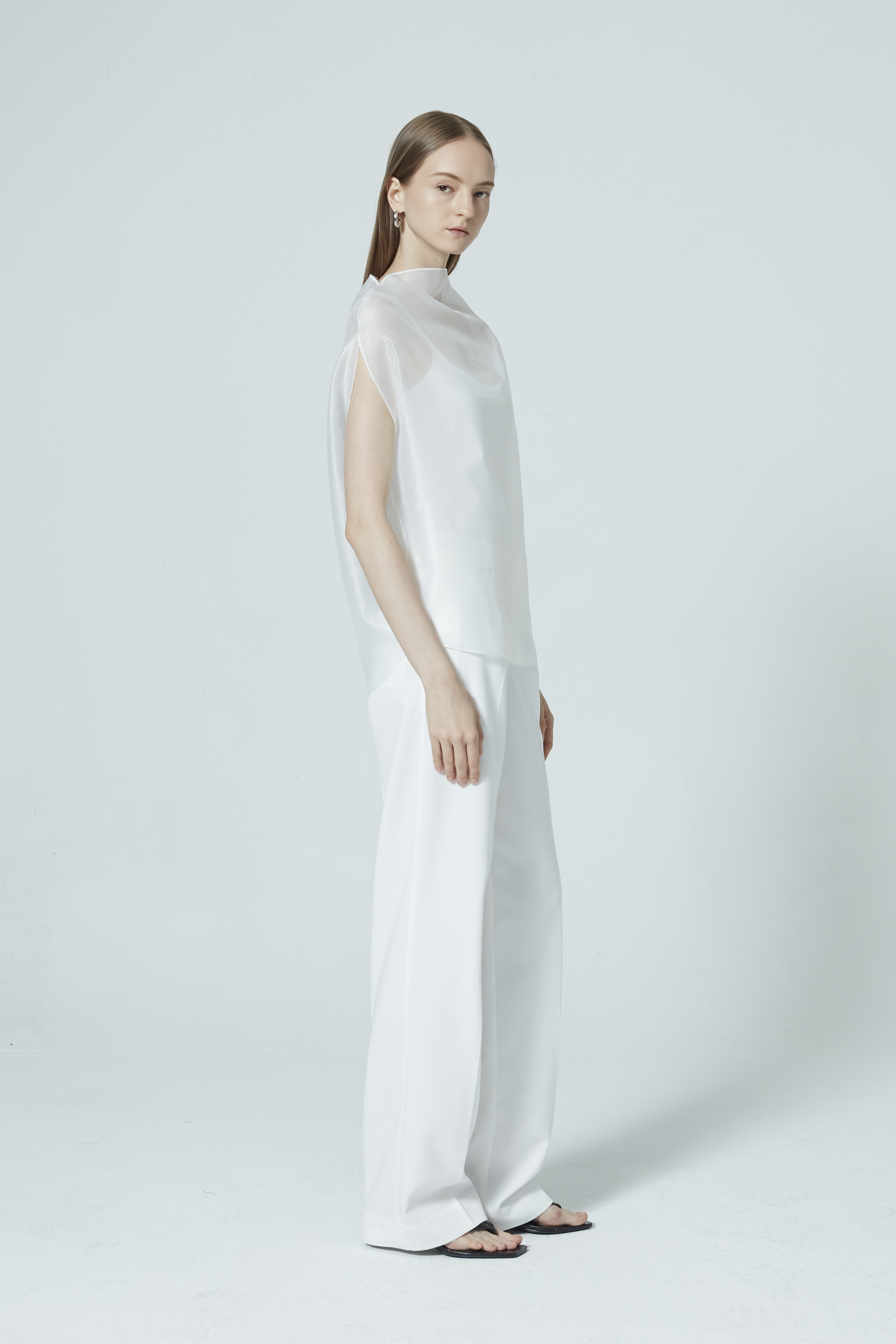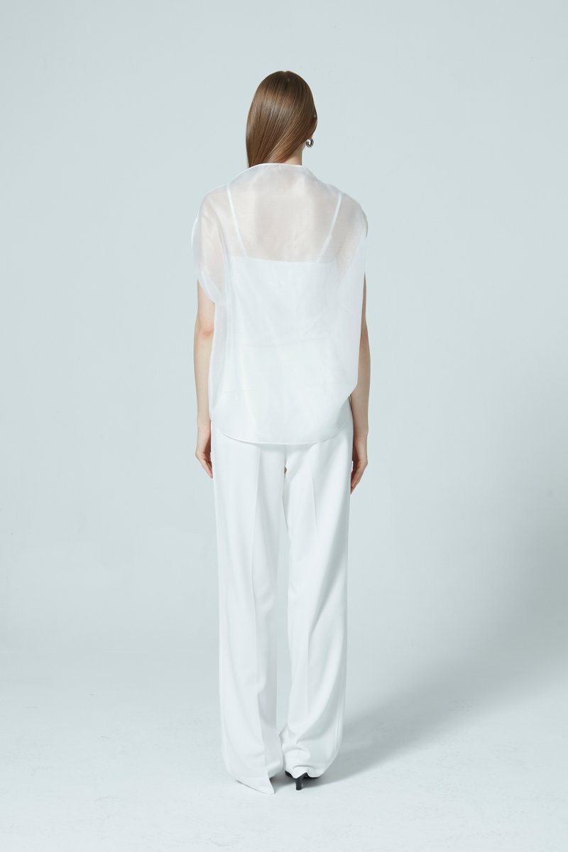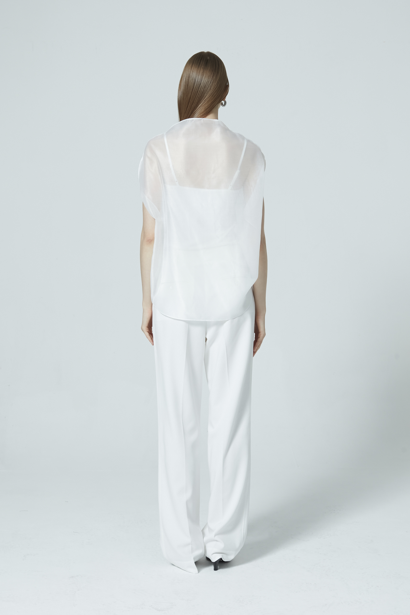Elegance meets ease with this top—a play of sheerness and structure, designed to drape with quiet confidence. Style with flared maxi skirts for added drama, or tone it down with simple tailored bottoms for a classic look.