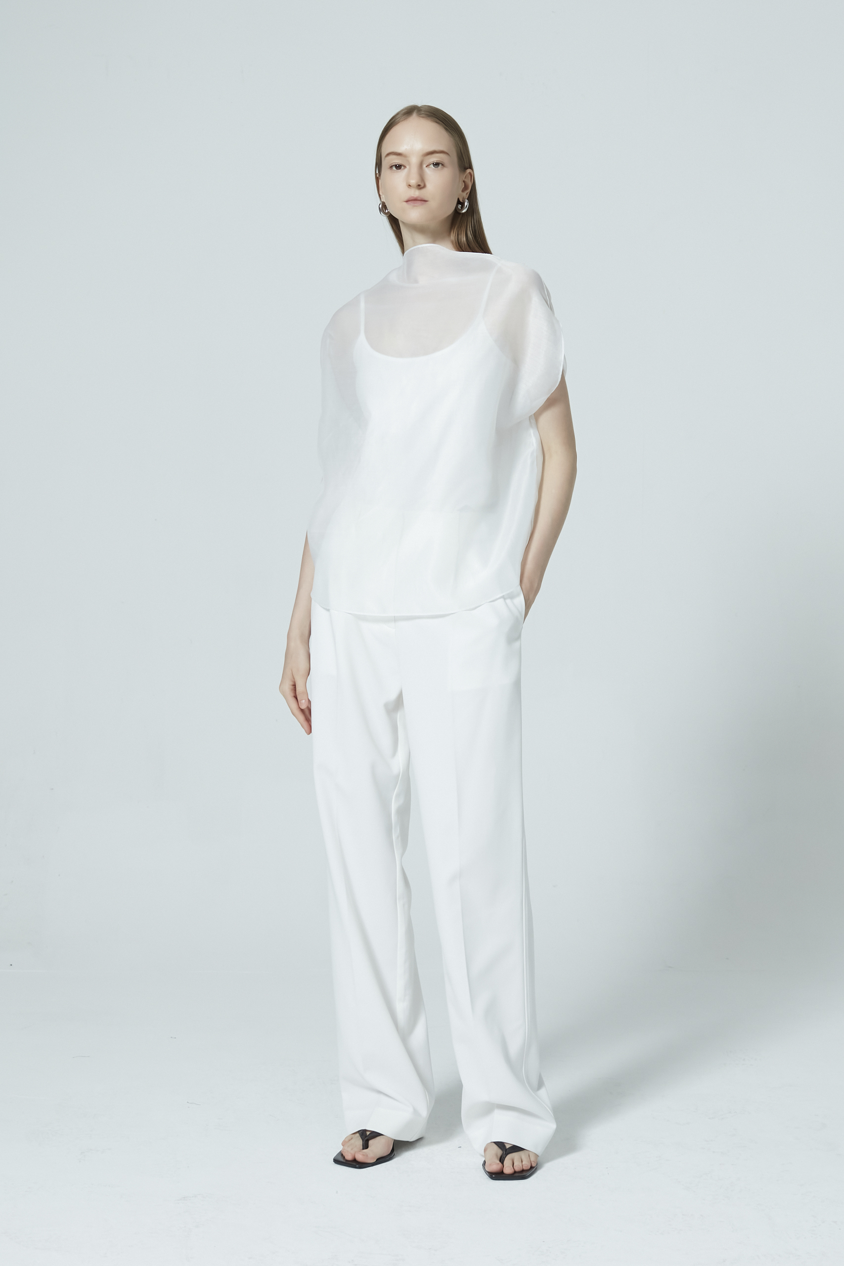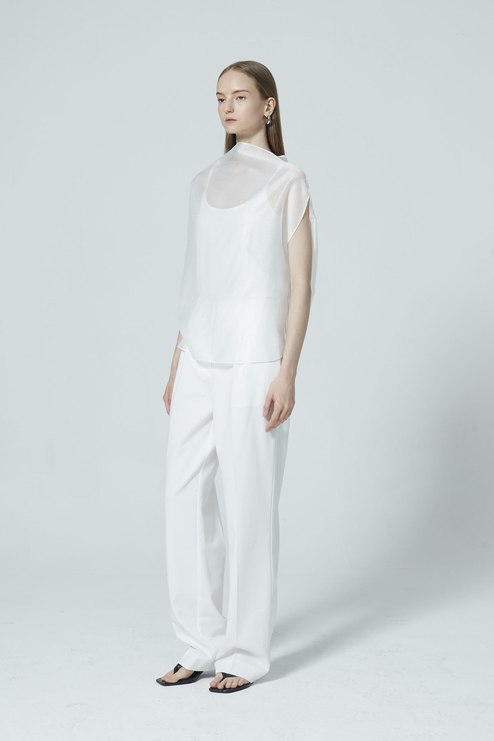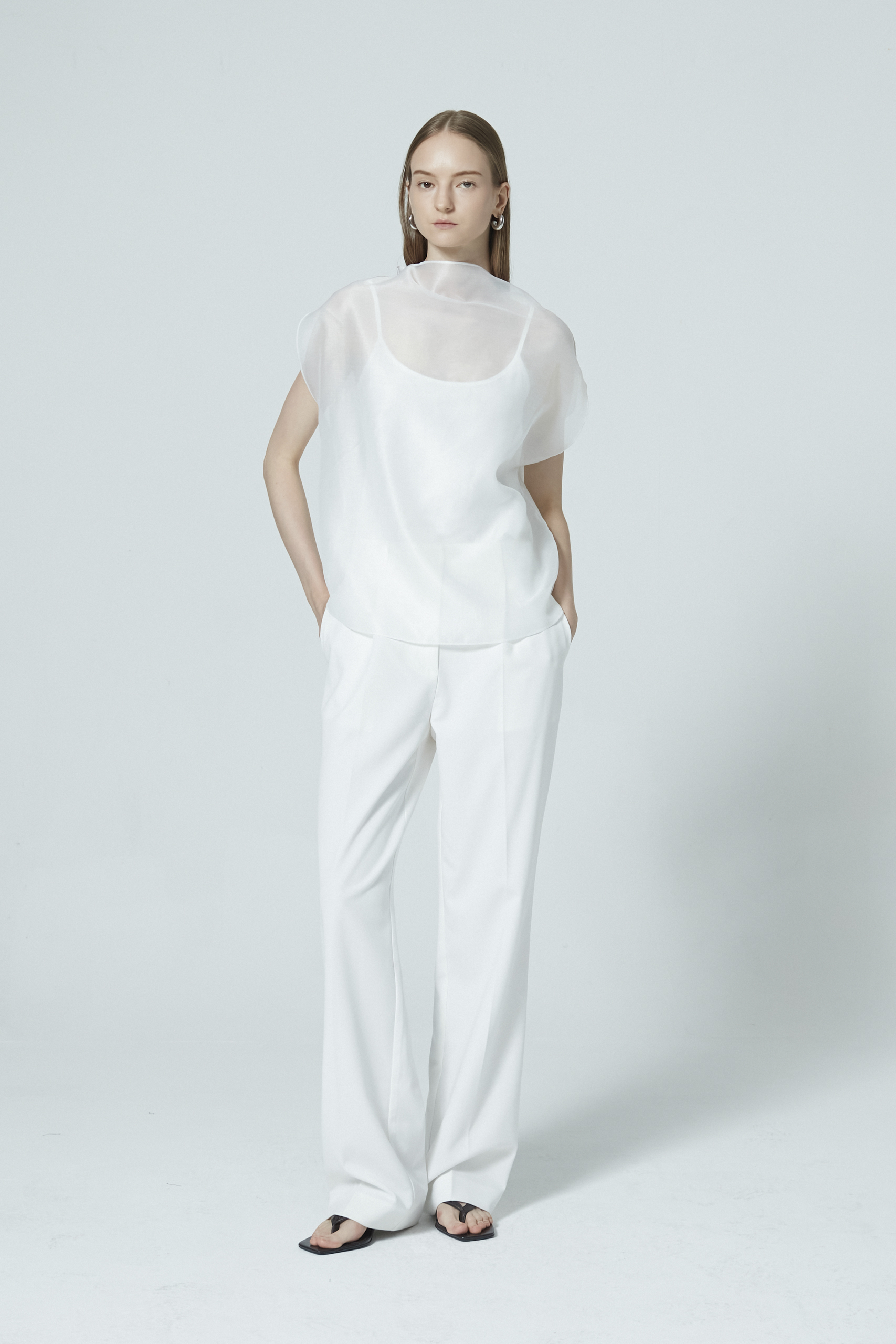 Elegance meets ease with this top—a play of sheerness and structure, designed to drape with quiet confidence. Style with flared maxi skirts for added drama, or tone it down with simple tailored bottoms for a classic look.