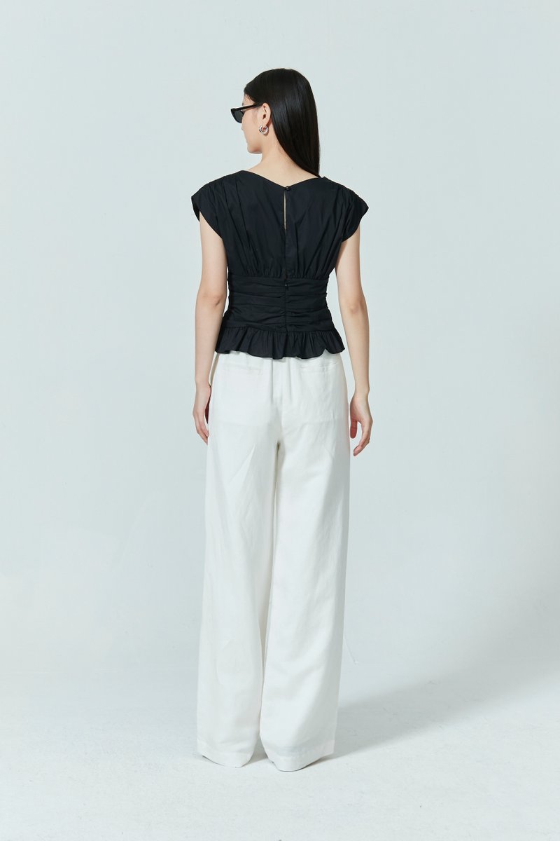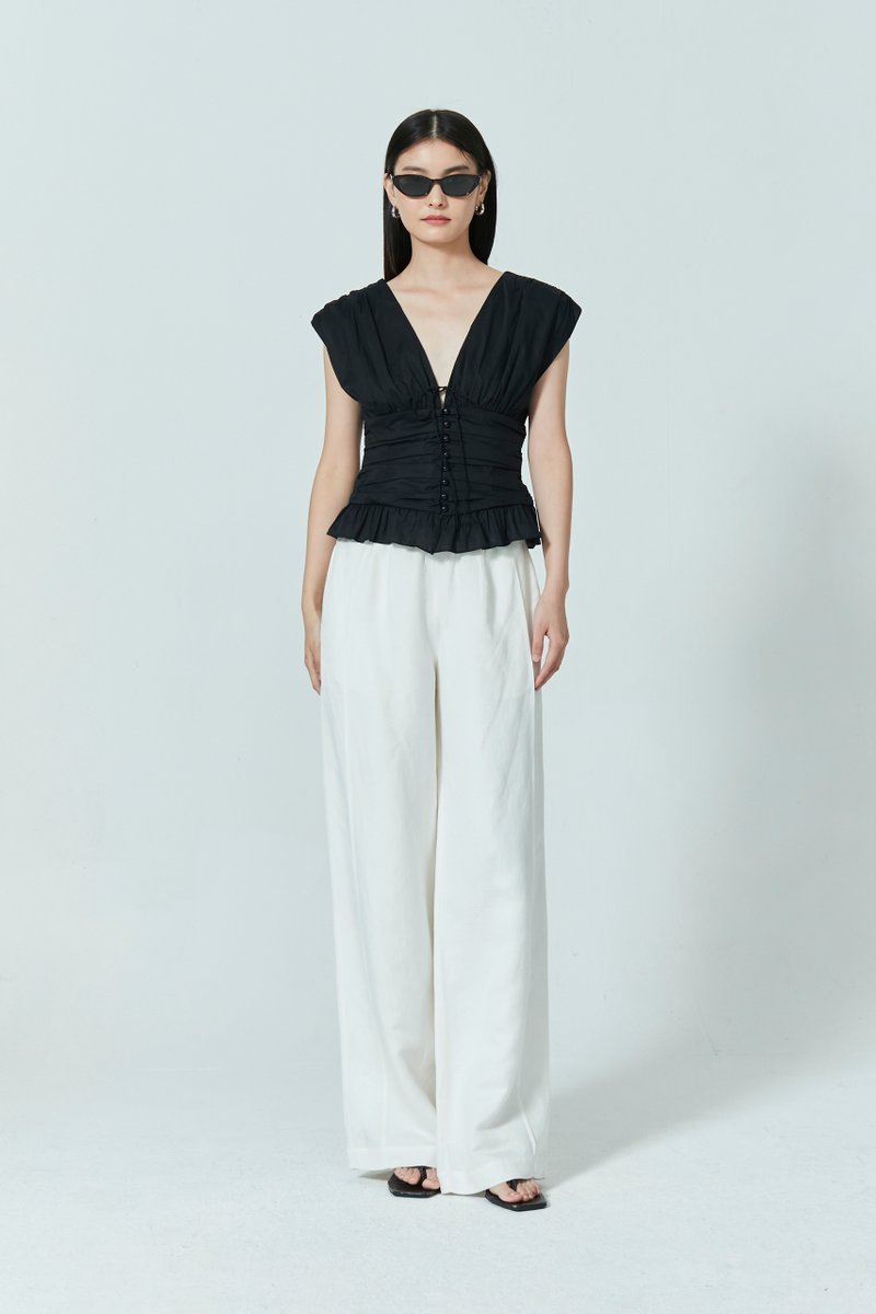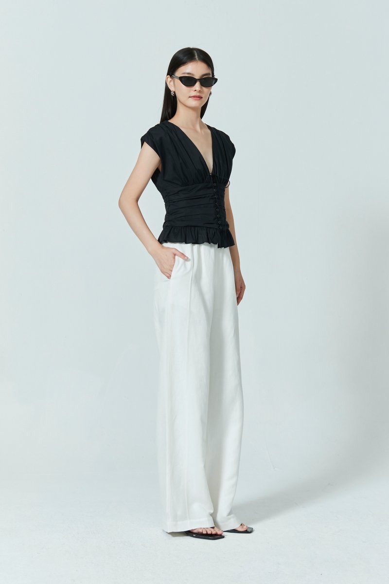 Flattering for all silhouettes, this ruched top features a deep v-neck with self-tie details and buttons down the front. Sophistication meets playfulness with this top, pairing easily with tailored bottoms and flowy skirts.