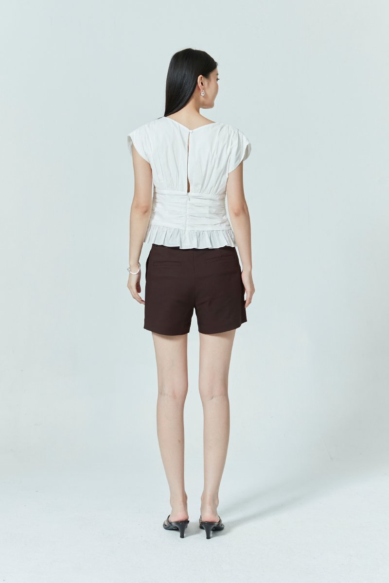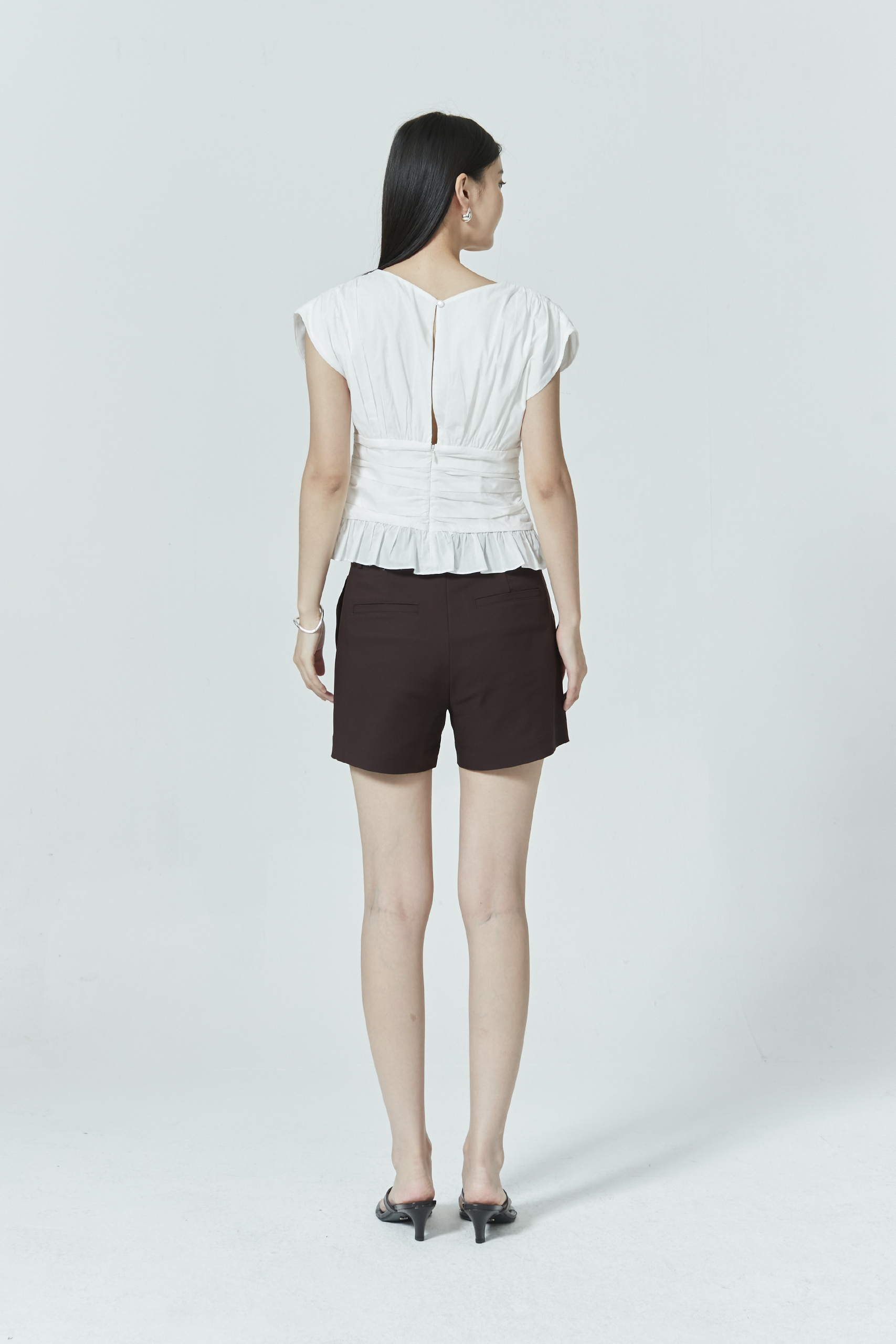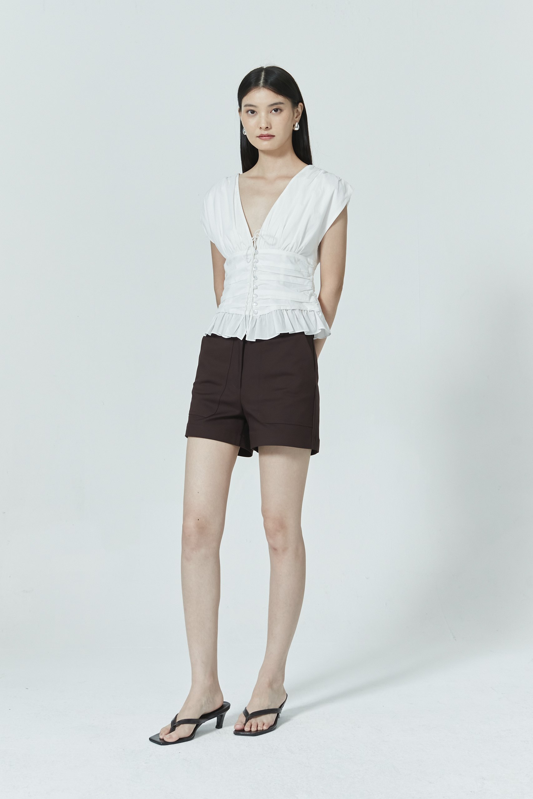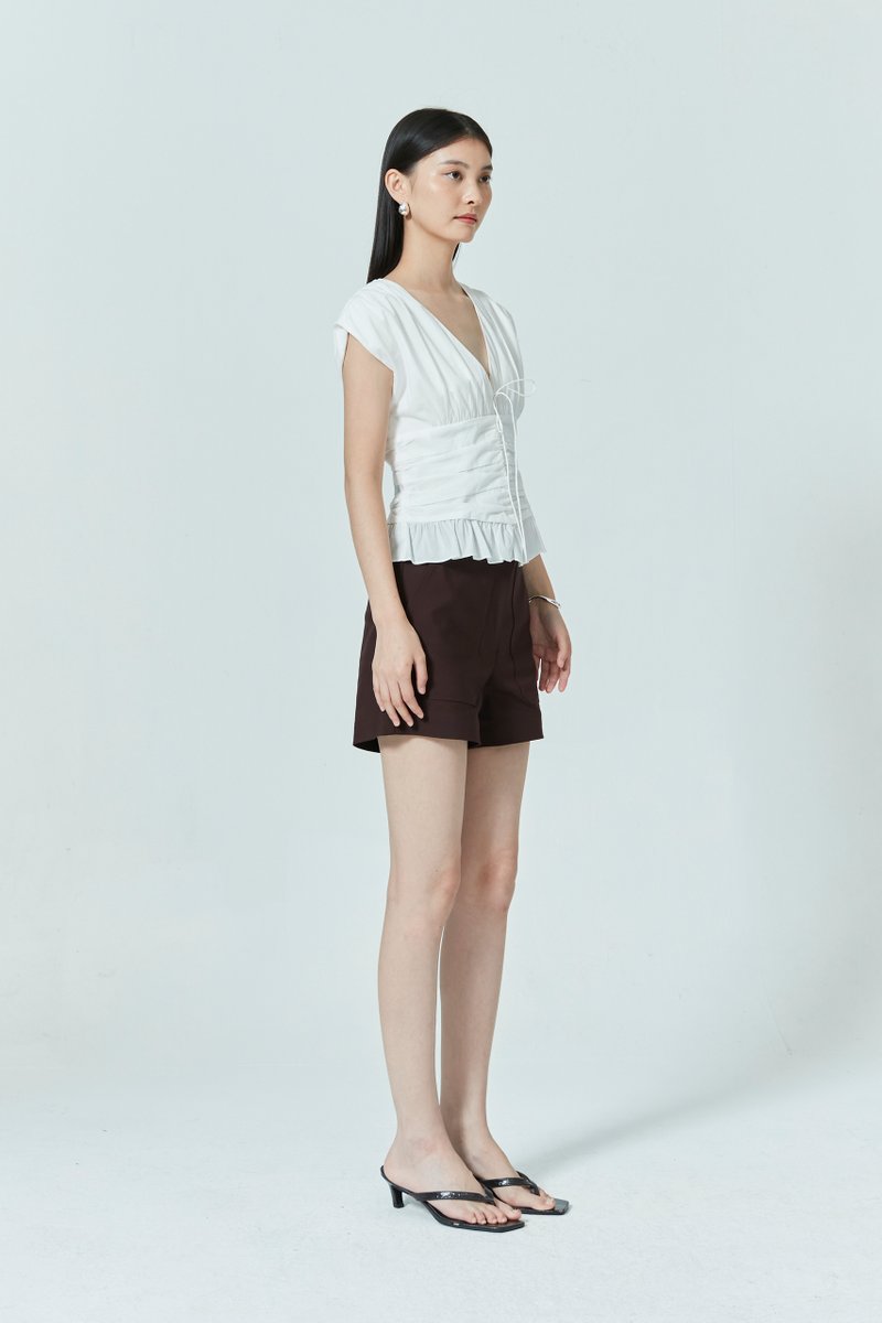 Flattering for all silhouettes, this ruched top features a deep v-neck with self-tie details and buttons down the front. Sophistication meets playfulness with this top, pairing easily with tailored bottoms and flowy skirts.