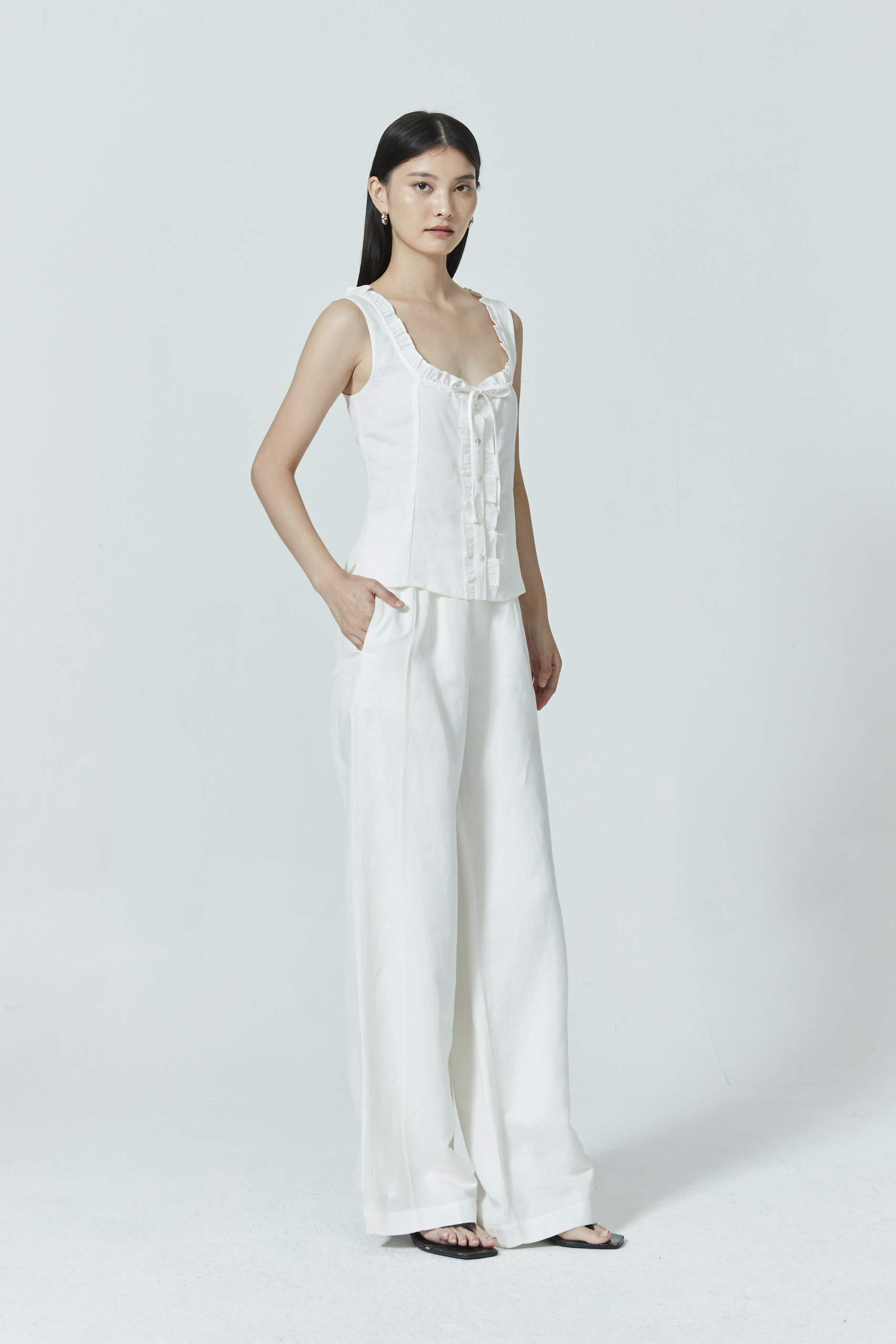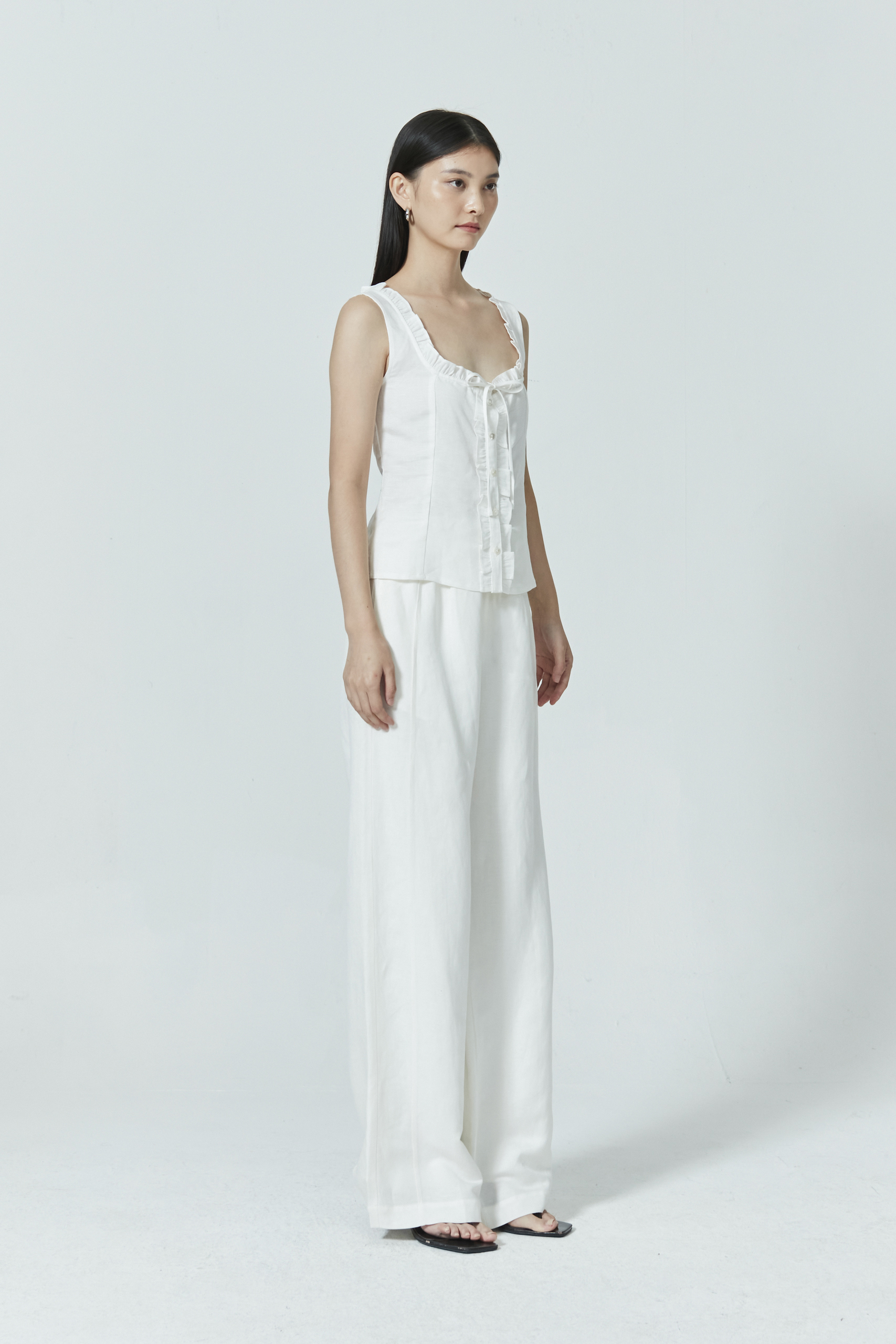 A classic feminine top, crafted in a soft, breathable linen blend. Stylized with a ruffle trim, button front, and drawstring, this top can be dressed up or down easily. Pair with denim for a casual chic look or style with a flowy maxi skirt for a cute summery vibe.