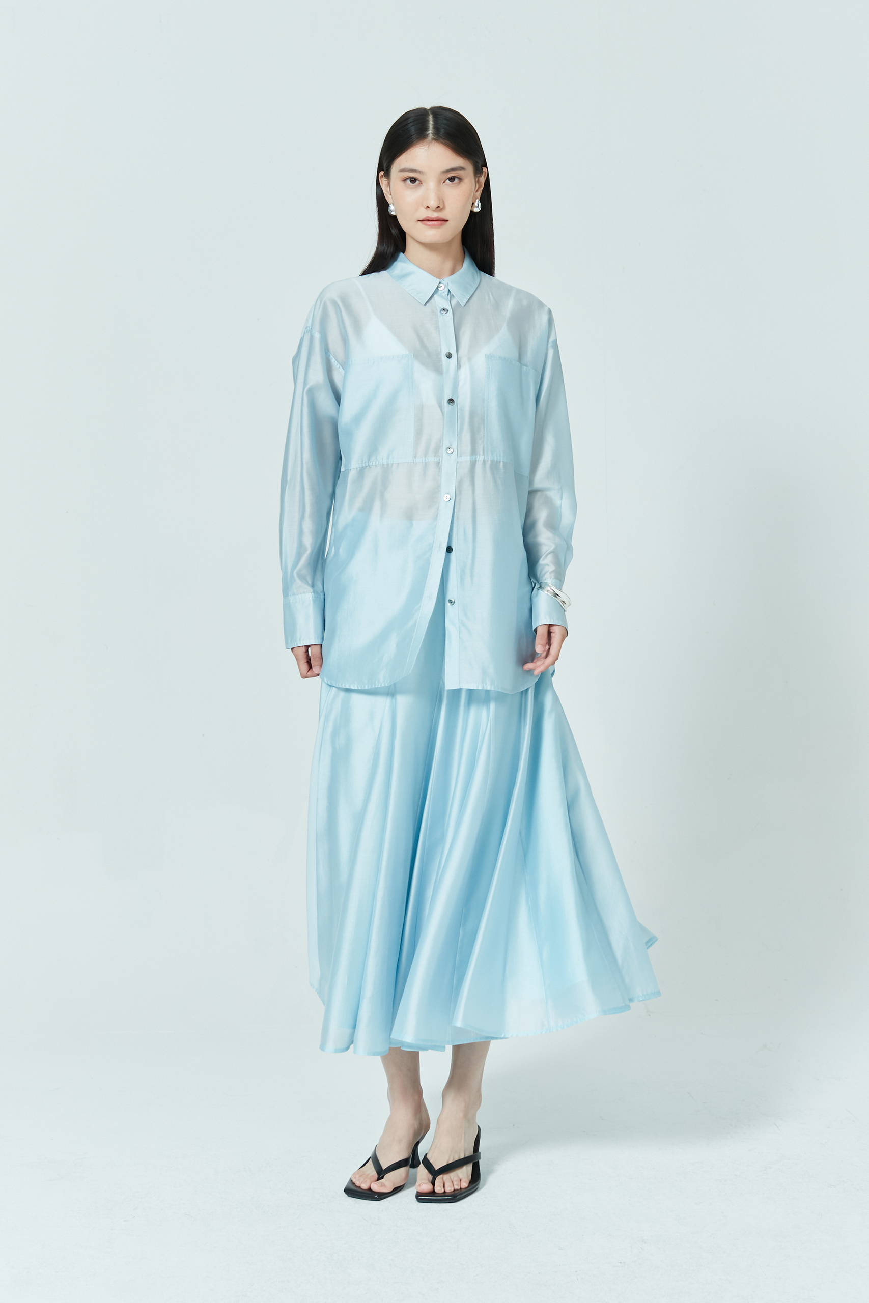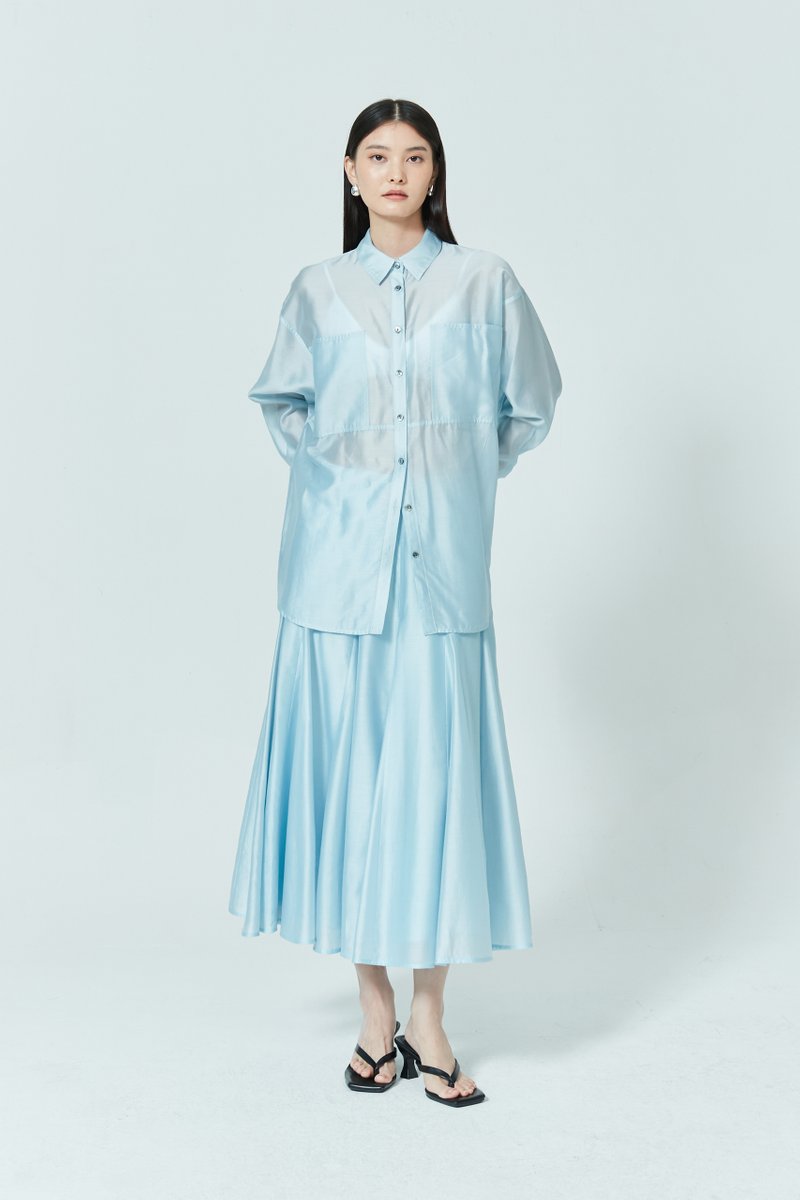 Light, effortless, and breathable—this sheer relaxed shirt is the perfect balance of warmth and coverage. Simply layer over a structured dress for contrast or pair with its matching skirt for a chic co-ord moment.
