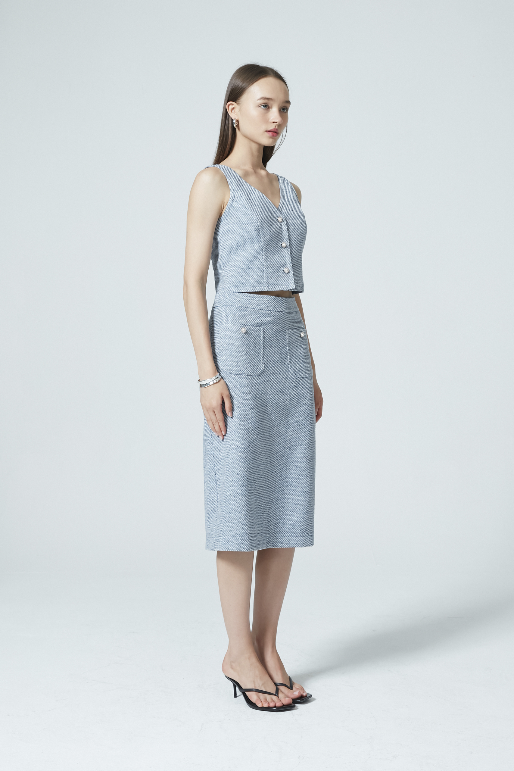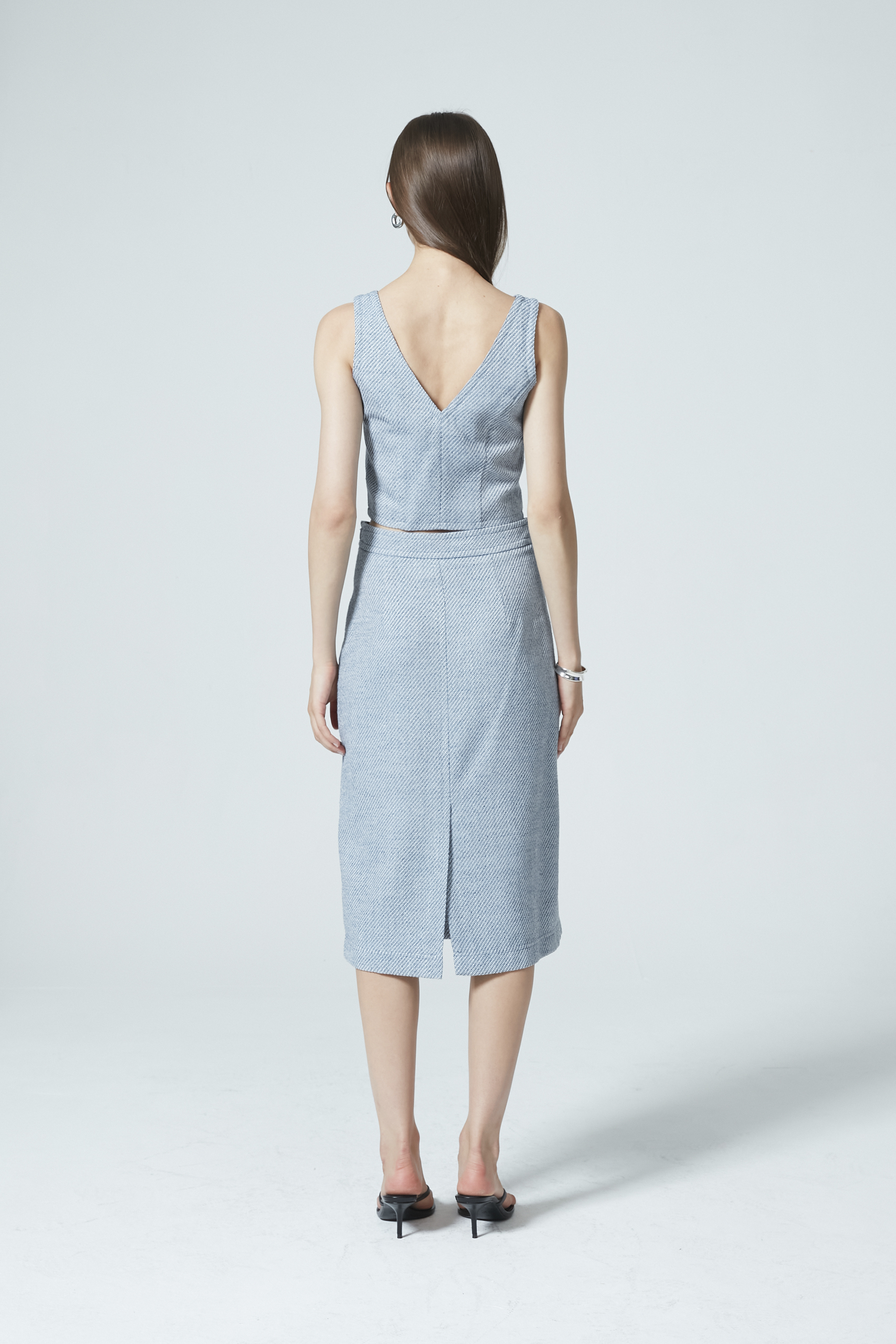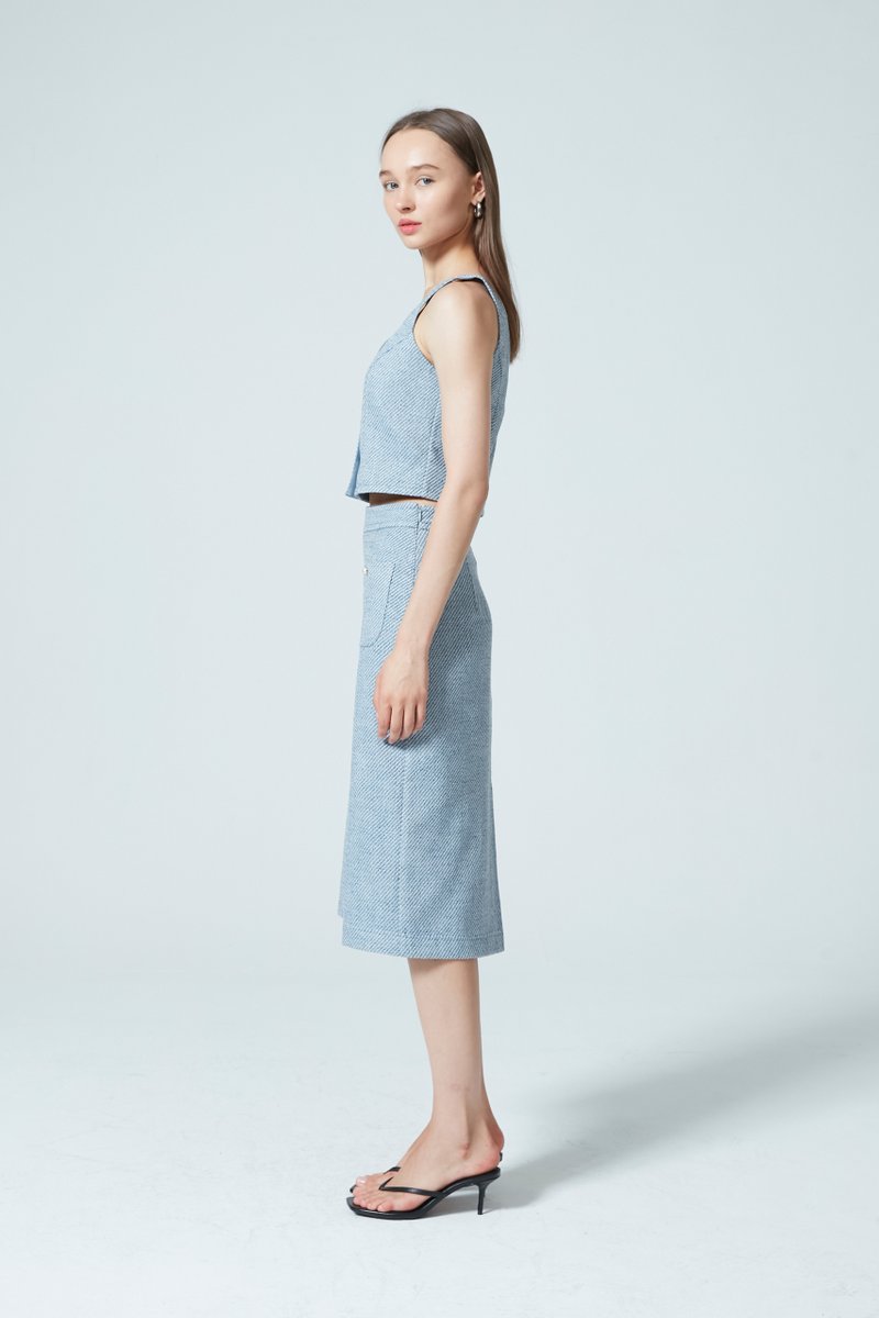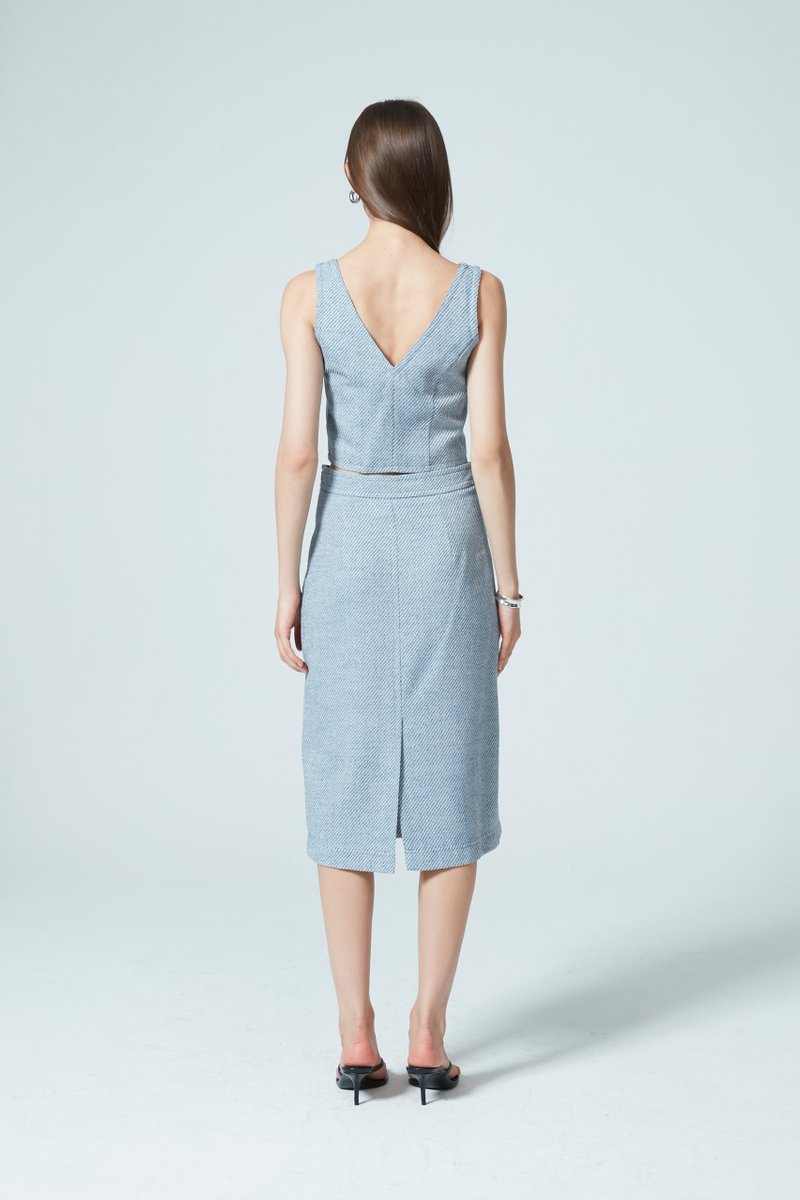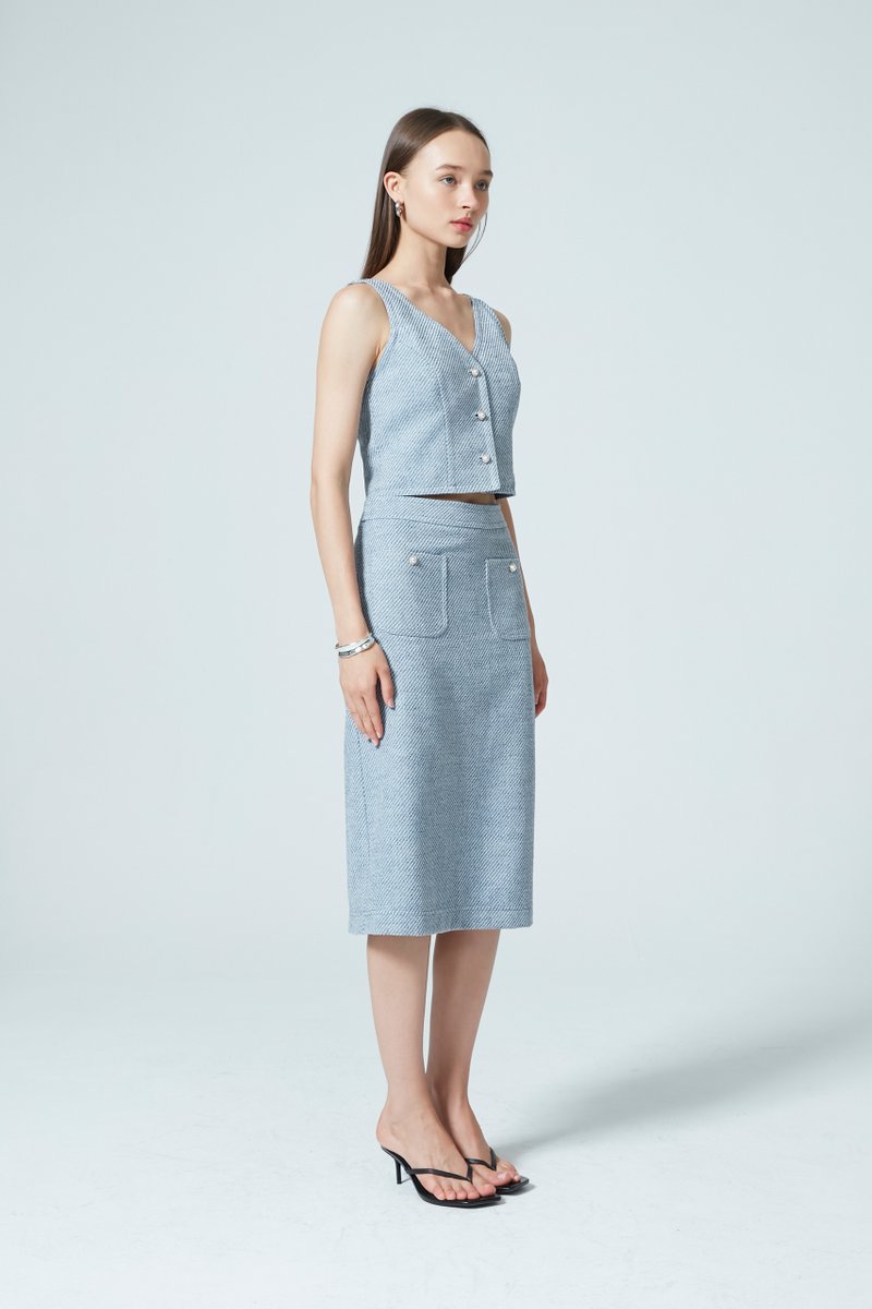 Cropped just above the waist, this tweed look is a timeless classic reimagined with a modern touch. Featuring a button front and contouring lines, this top pairs perfectly with its matching shorts and midi skirt for a chic all-tweed look.